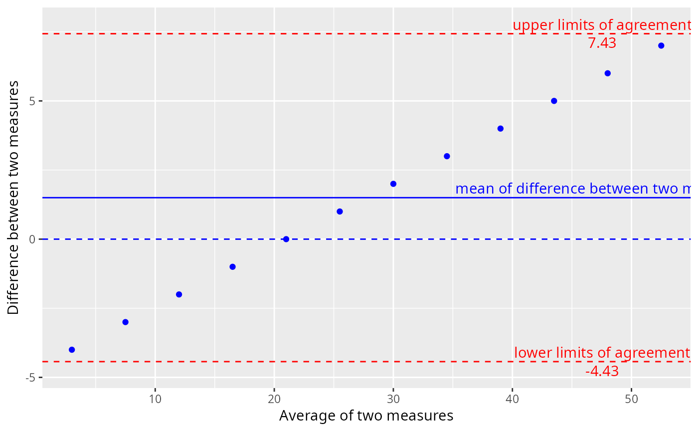 g_bland_altman(x = x, y = y, conf_level = 0.9)
