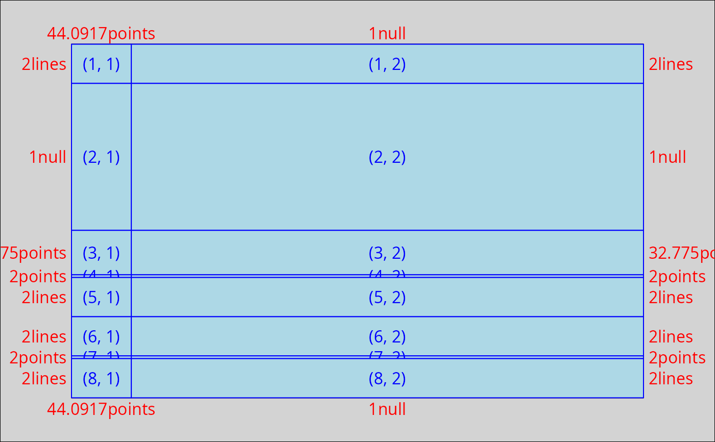 The layout corresponds to a grid of two columns and five rows of unequal dimensions. Most of the dimension are fixed, only the curve is flexible and will accommodate with the remaining free space.