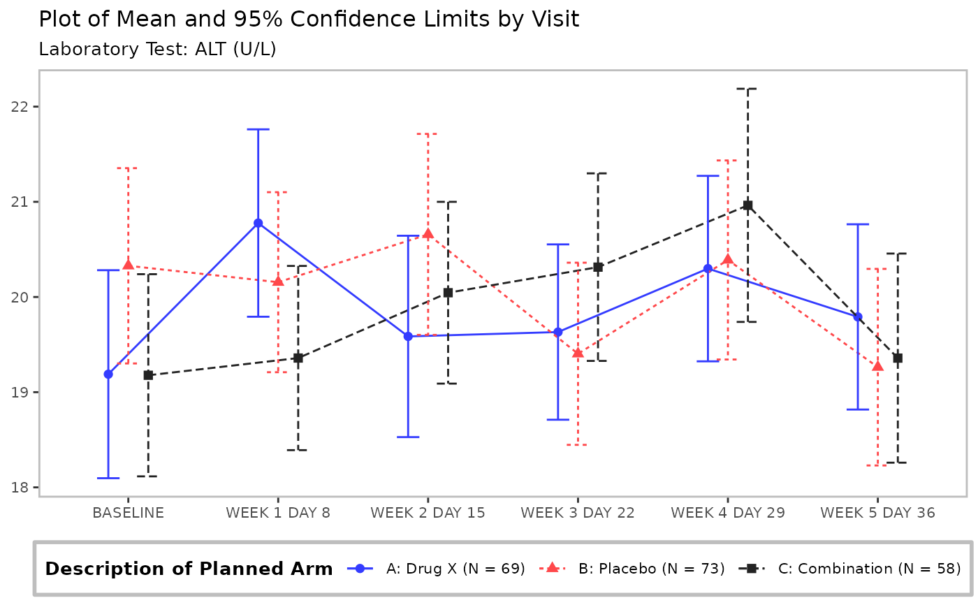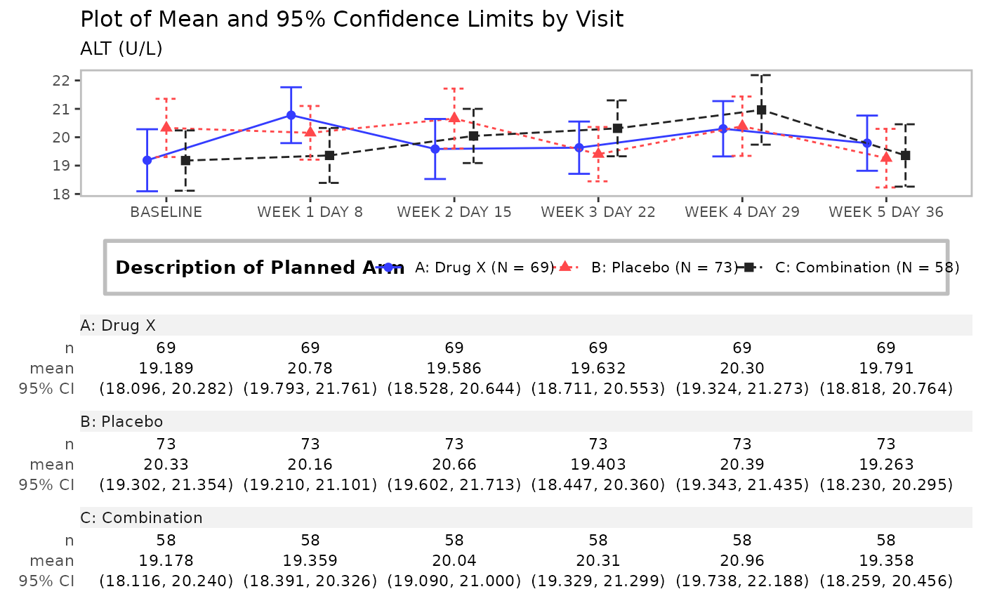 g_lineplot(adlb, adsl, table = c("n", "mean", "mean_ci"))