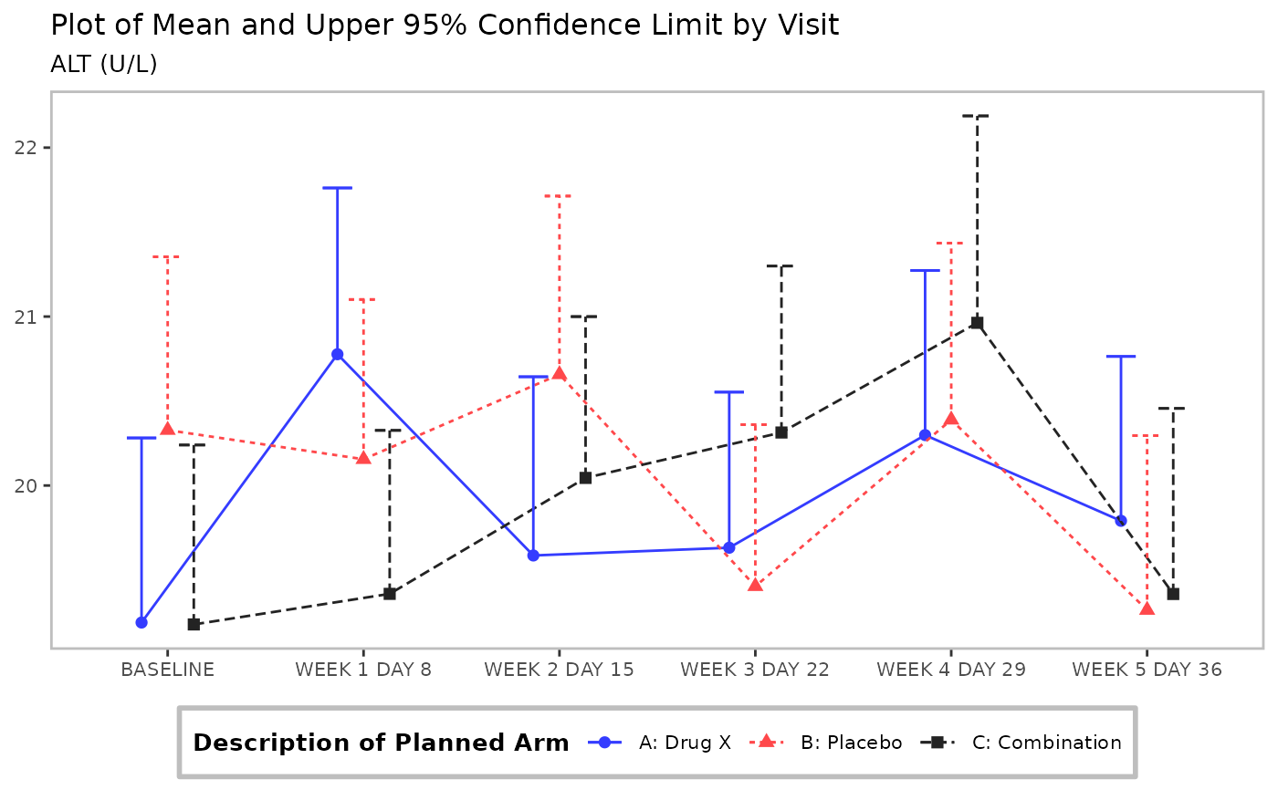 title = "Plot of Mean and Upper 95% Confidence Limit by Visit"
