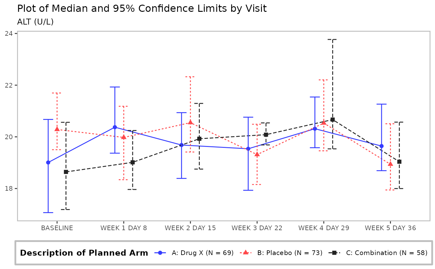title = "Plot of Median and 95% Confidence Limits by Visit"