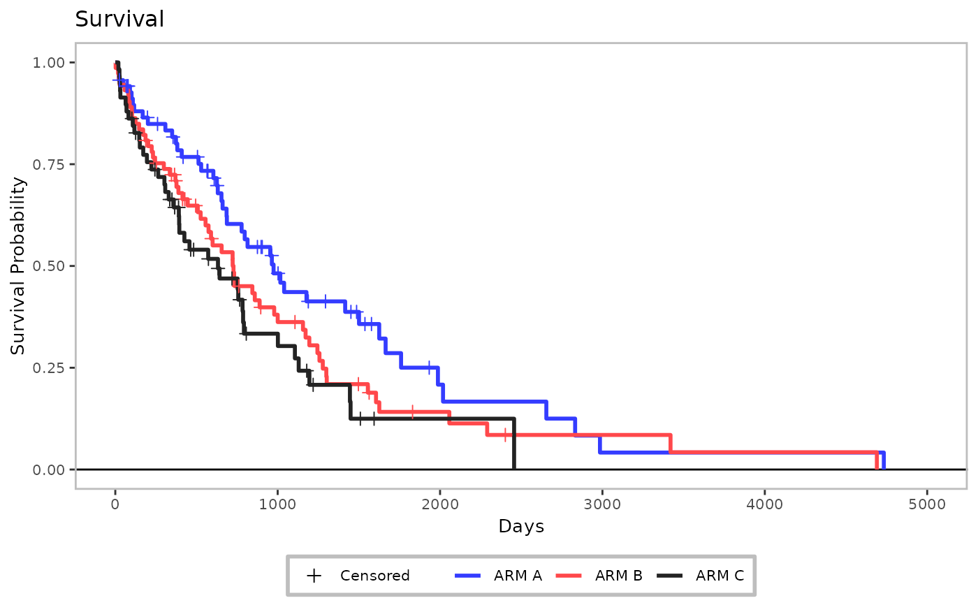 survfit(formula = Surv(AVAL, 1 - CNSR) ~ ARMCD, data = .)