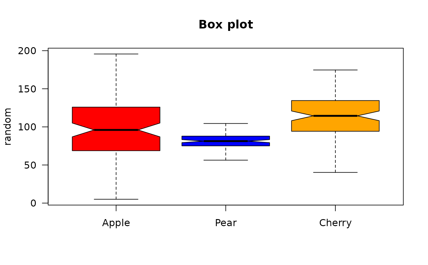 boxplot(s, notch=TRUE, col=c("red", "blue", "orange"), main="Box plot", ylab="random", las=1)