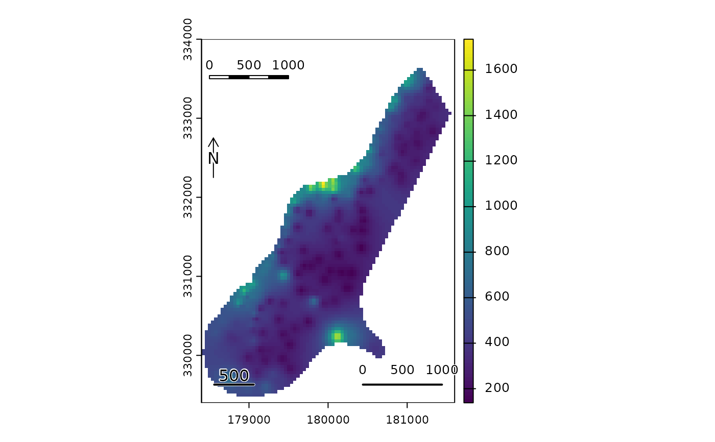 sbar(1000, xy=c(178500, 333500), type="bar", divs=4, cex=.8)