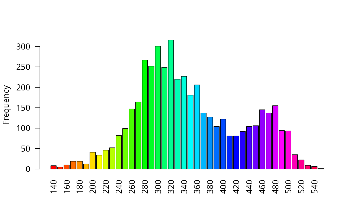 barplot.RdCreate a barplot of the values of the first layer of a SpatRaster. For large datasets a regular sample with a size of approximately maxcells is used.