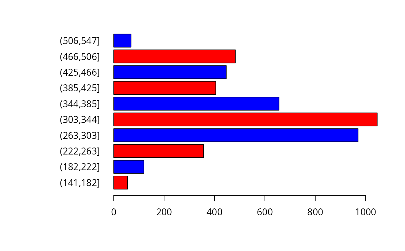 barplot(height, maxcell=1000000, digits=0, breaks=NULL, col, ...)Arguments