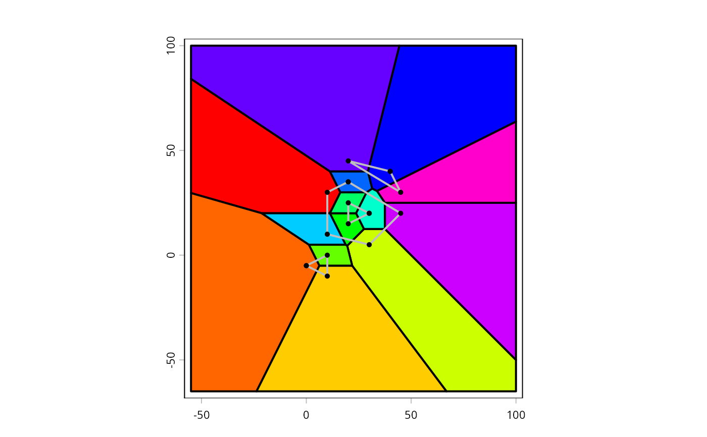 voronoi.RdGet a Voronoi diagram or Delaunay triangles for points, or the nodes of lines or polygons