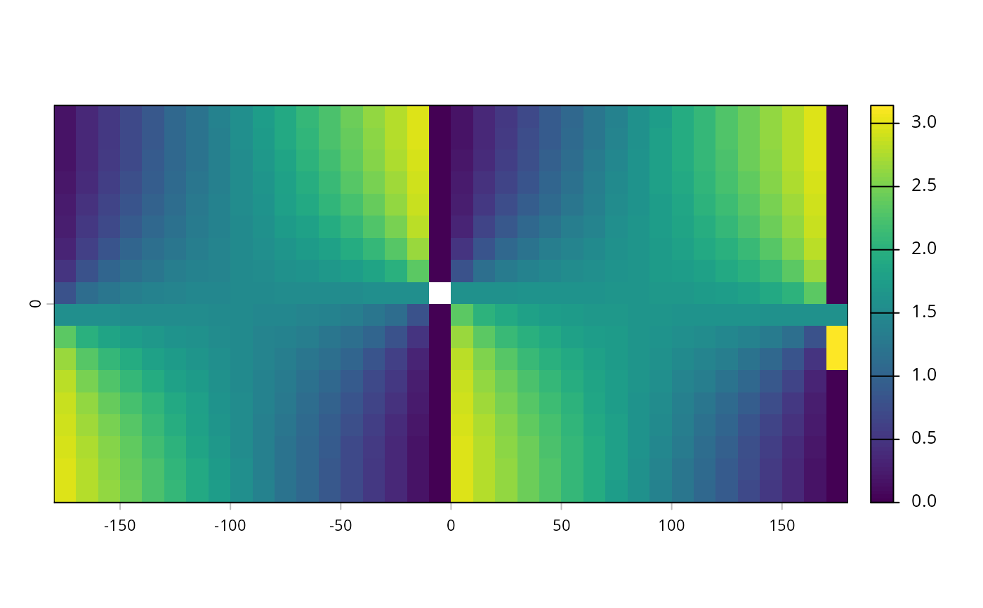 direction.RdThe direction (azimuth) to or from the nearest cell that is not NA. The direction is expressed in radians, unless you use argument degrees=TRUE.