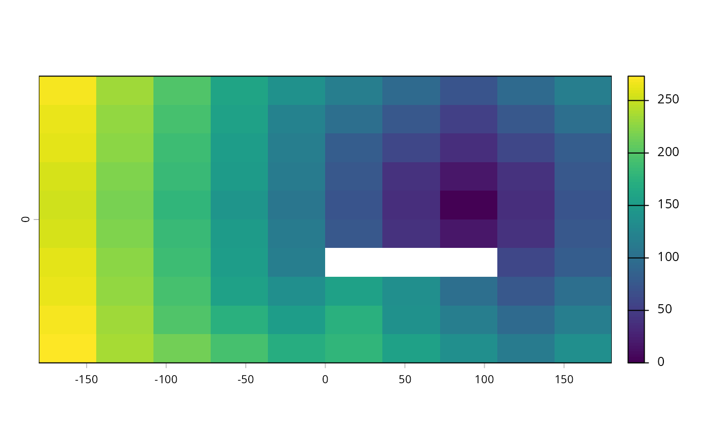 The shortest distance to the cells with the target value is computed for all cells that are not NA. Cells that are NA cannot be traversed and are ignored, unless the target itself is NA, in which case the distance to the nearest cell that is not NA is computed for all cells that are NA.