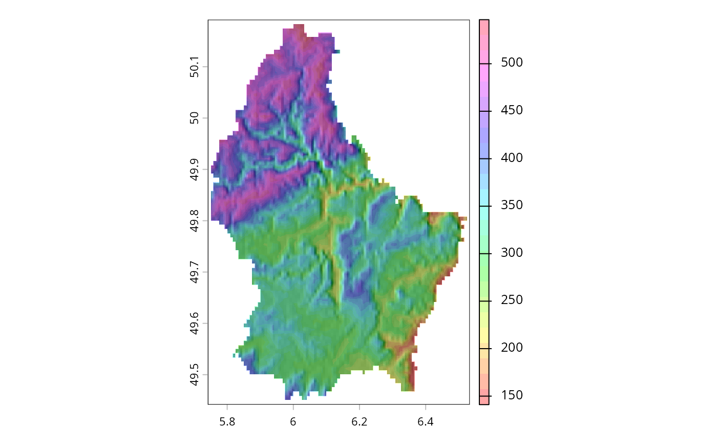 plot(r, col=rainbow(25, alpha=0.35), add=TRUE)