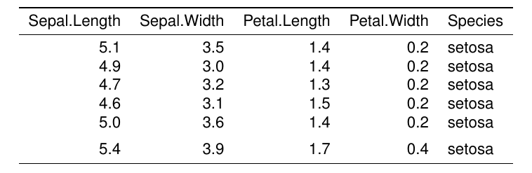 5.1 & 3.5 & 1.4 & 0.2 & setosa\\