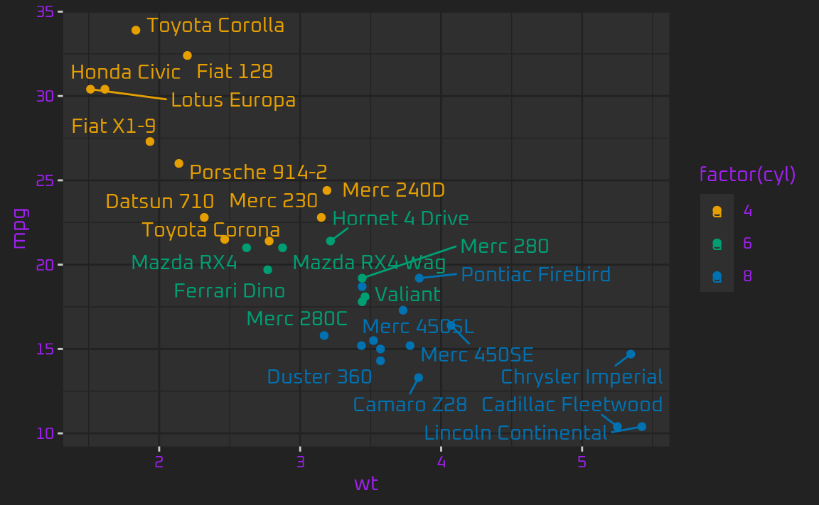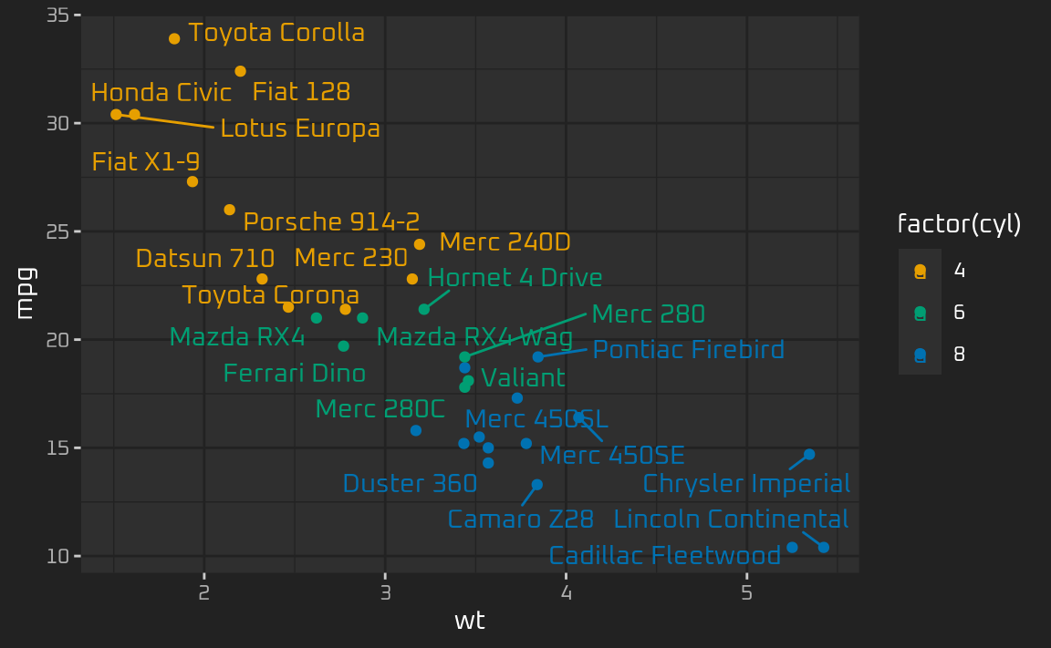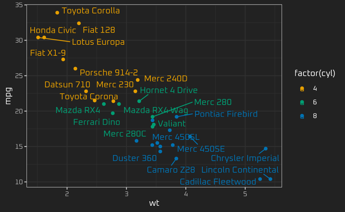 ggplot(mtcars, aes(wt, mpg, label = rownames(mtcars), color = factor(cyl))) +