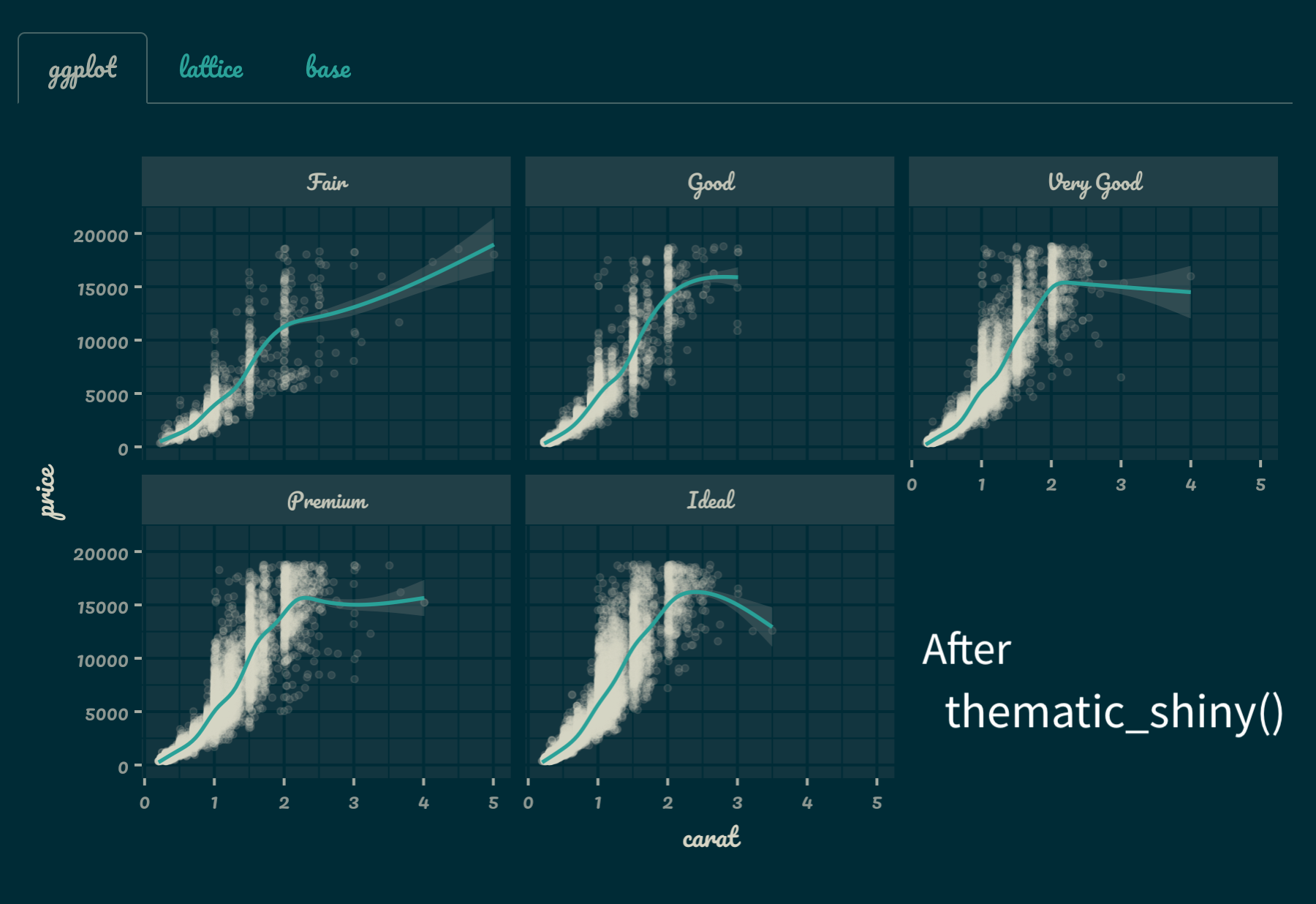 Call thematic_on() before generating plots inside RStudio to have all subsequent plots shown in the “Plots” viewing pane to reflect your RStudio theme. Note that thematic_on() enables thematic for the remainder of the R session, but you can use thematic_off() to disable (or thematic_theme() for one-off use of {thematic}). Here’s an example of how thematic can intelligently adapt each plot to the current RStudio theme: