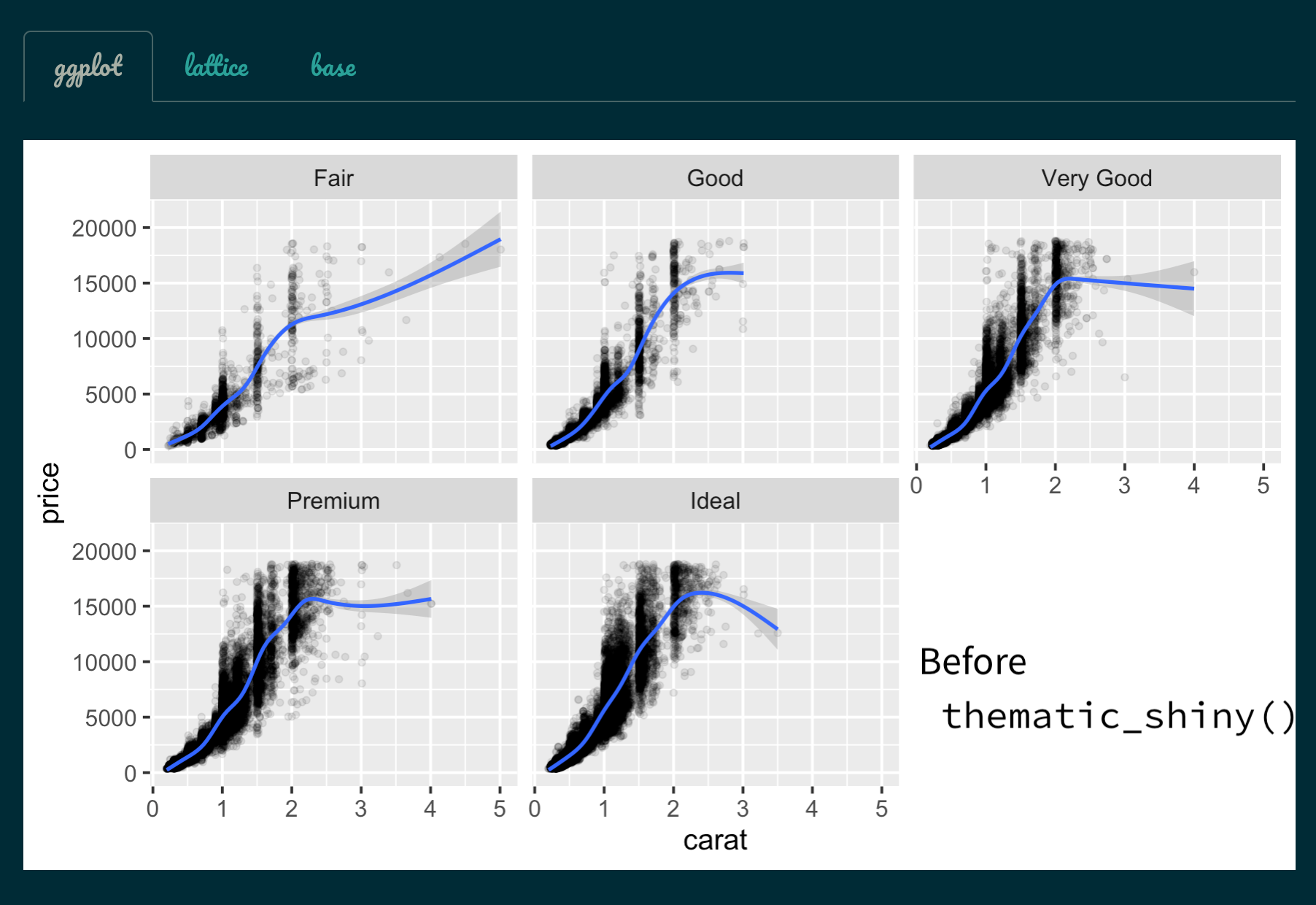 Simplified theming of ggplot2, lattice, and {base} R graphics. In addition to providing a centralized approach to styling R graphics, thematic also enables automatic styling of R plots in Shiny, R Markdown, and RStudio.
