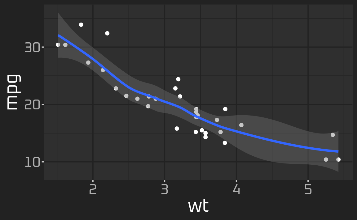 ggsmooth <- ggplot(mtcars, aes(wt, mpg)) + geom_point() + geom_smooth()