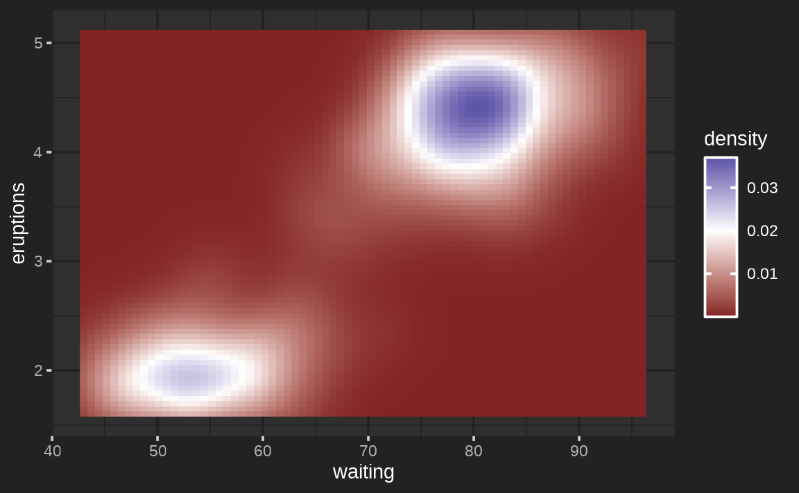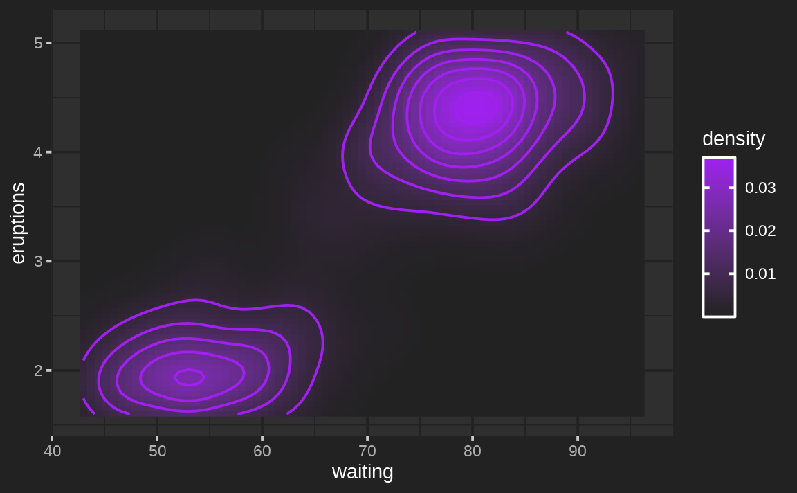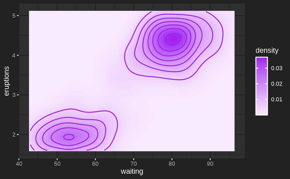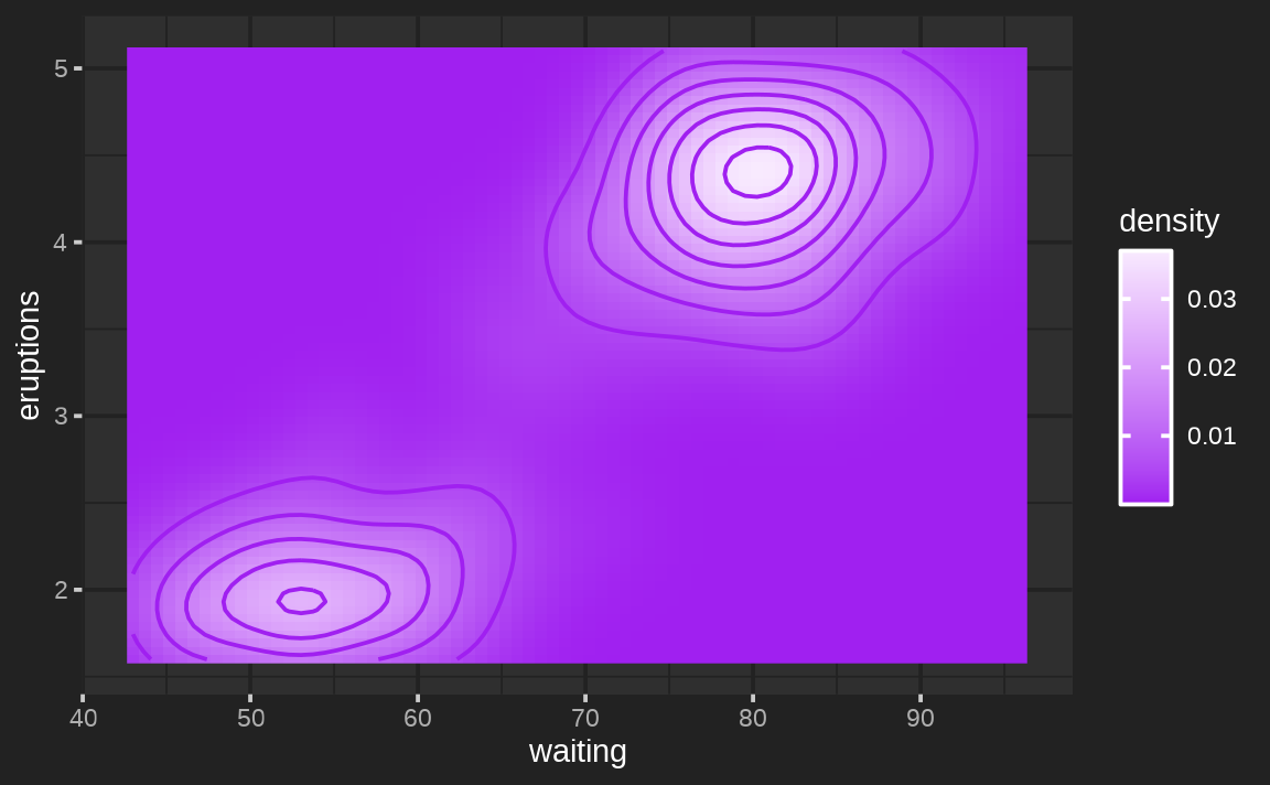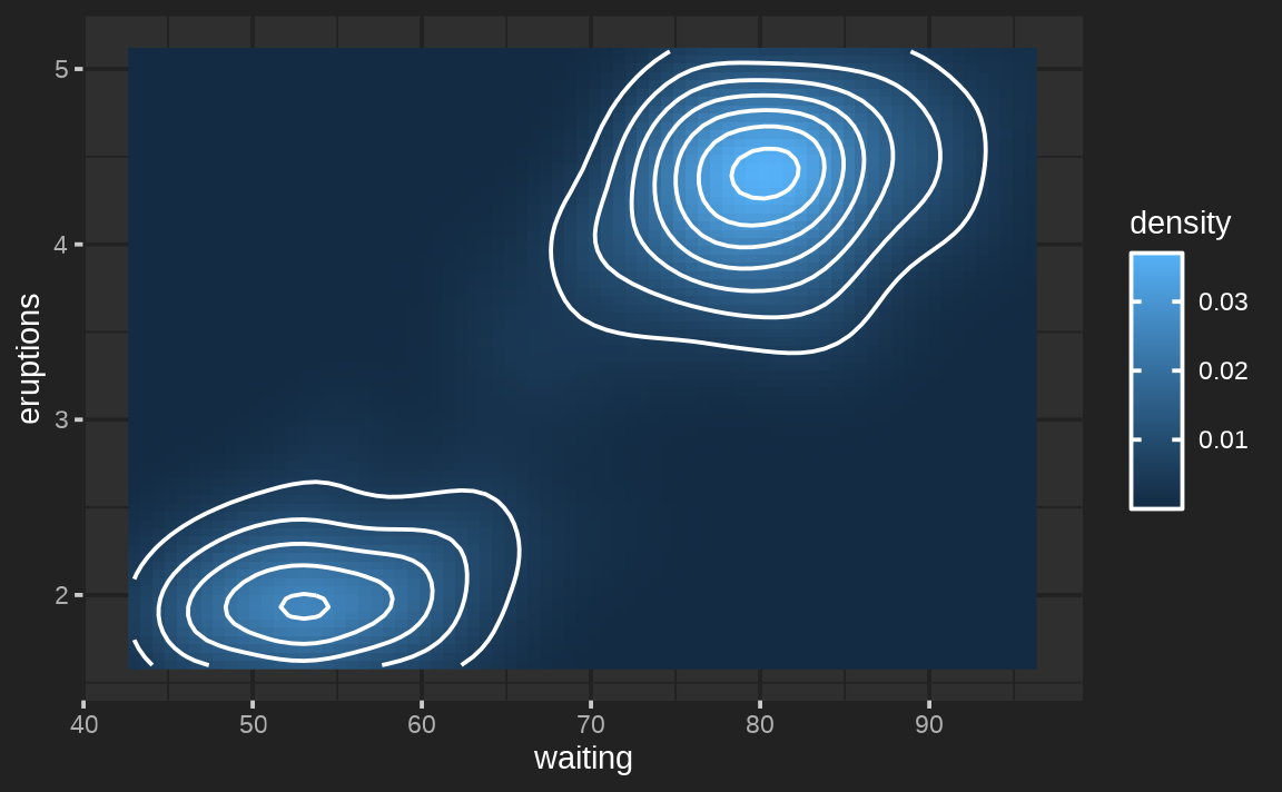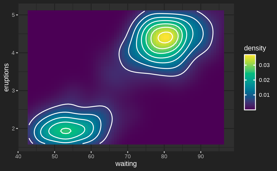 ggplot(faithfuld, aes(waiting, eruptions, z = density)) +