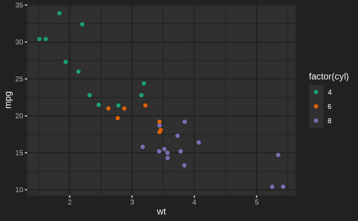 ggplot(mtcars, aes(wt, mpg, color = factor(cyl))) + geom_point()