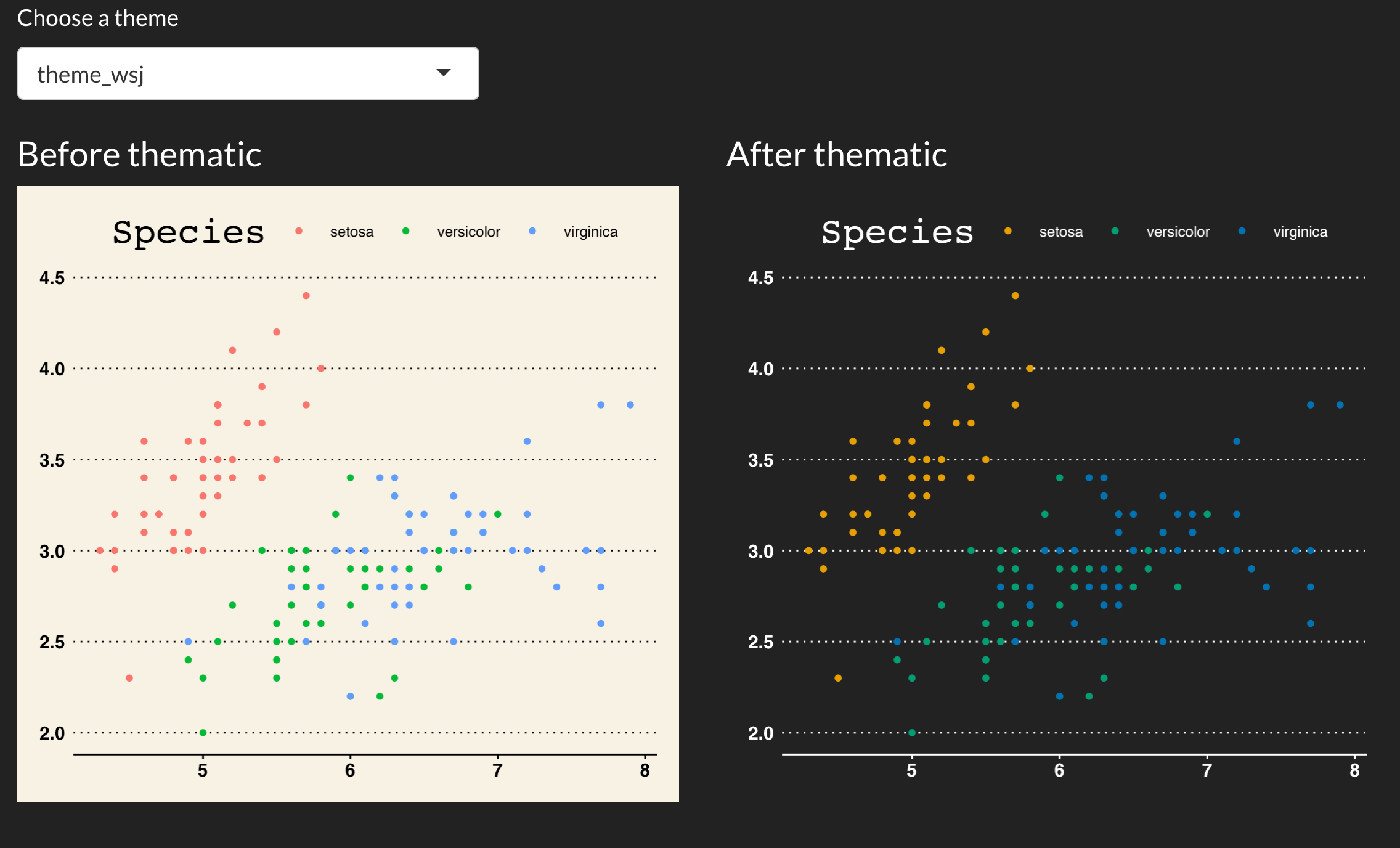 Other ggplot2 extension packages such as ggthemes also provide useful complete themes. The image below links to a Shiny app that allows you to preview how various ggthemes themes look both before and after thematic in a Shiny app with some custom CSS.