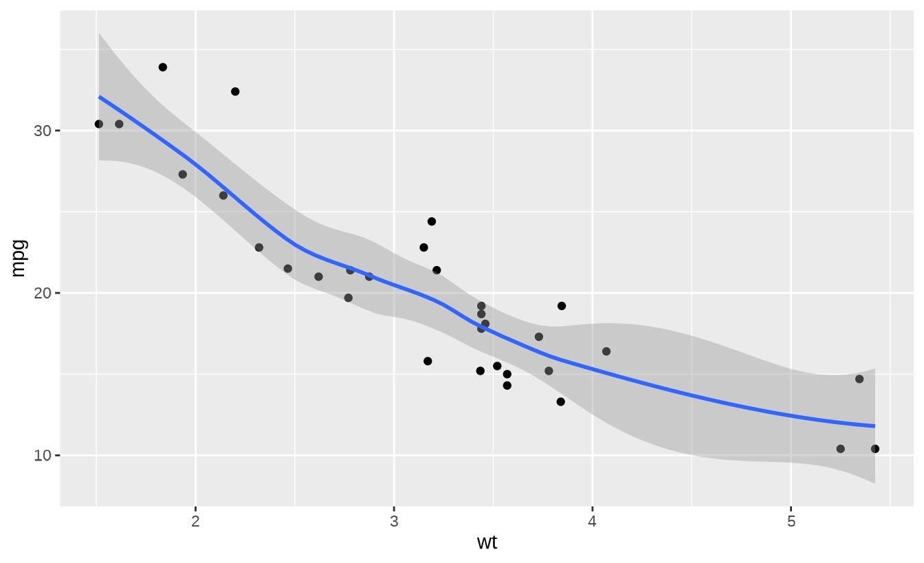 ggsmooth <- ggplot(mtcars, aes(wt, mpg)) + geom_point() + geom_smooth()