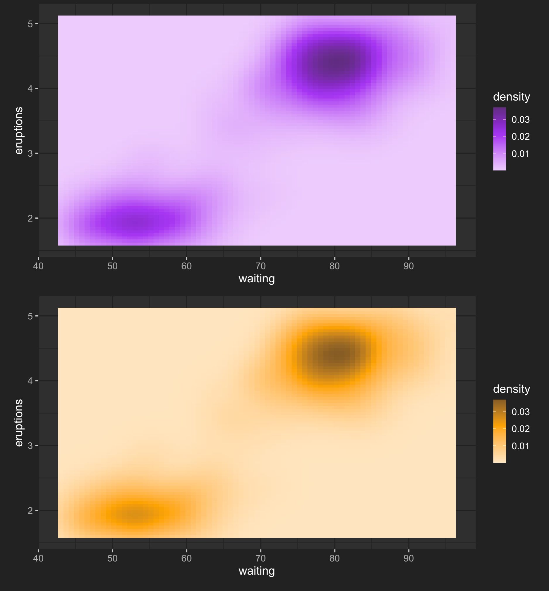 p <- ggplot(faithfuld, aes(waiting, eruptions)) +