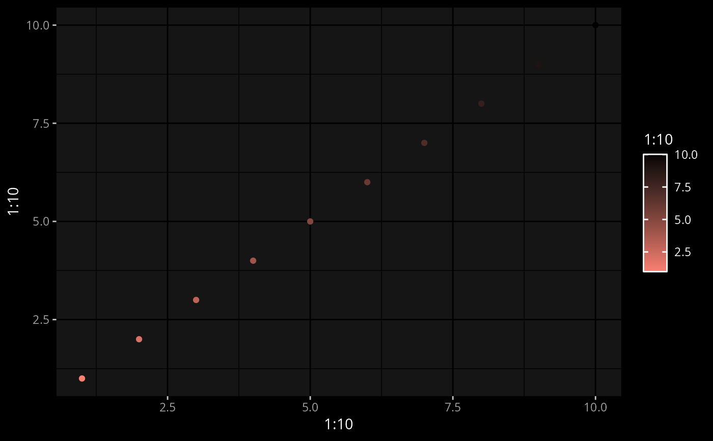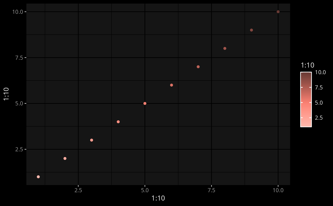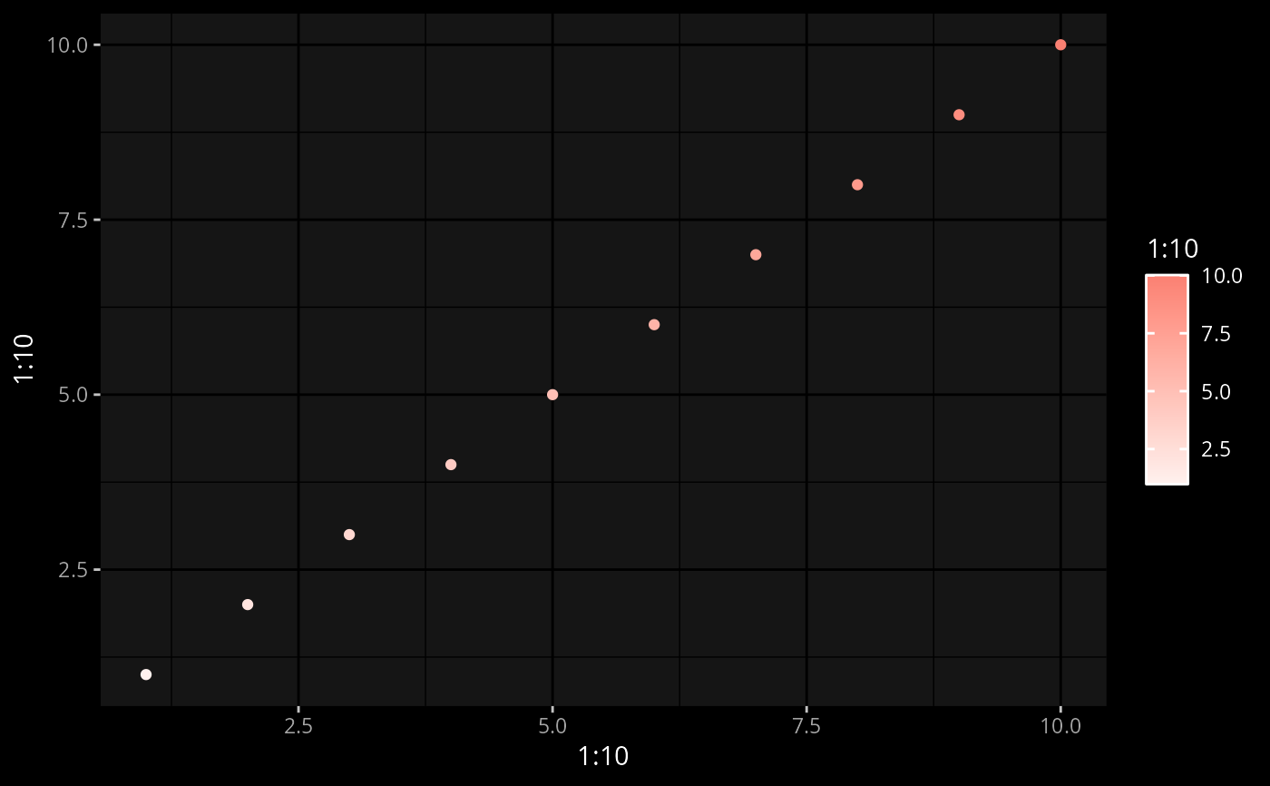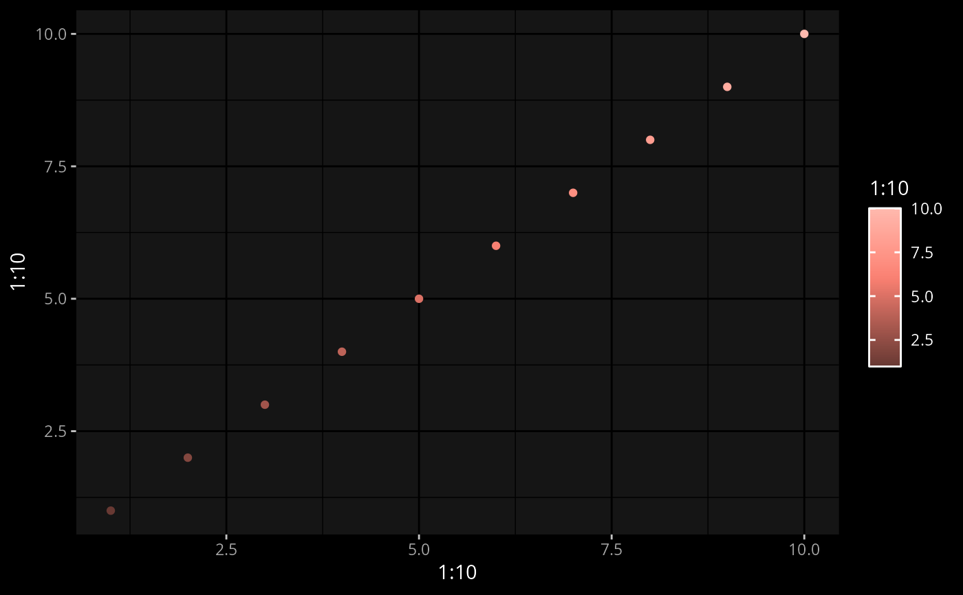 ggplot2::qplot(1:10, 1:10, color = 1:10)