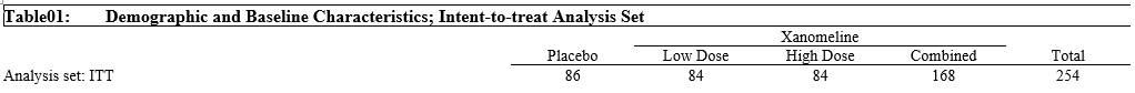 | Analysis set: ITT | 86 | 84 | 84 | 168 | 254 | HEADER | 1 | 0 | 1 | 0 | 0 |