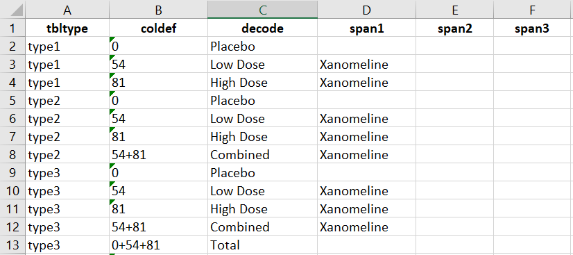 Different types of column layouts identified by different tbltype can be stored in an excel file called column_metadata.xlsx. Within each tbltype, the coldef variable defines the order of the column based on the column variable used for creating the output (typically the numeric treatment variable, TRT01PN, is used as the column variable). For example, there are 3 columns for tbltype = “type1” in the above snapshot and the column layout is defined as follows: the first column of summary statistics represents the treatment group of TRT01PN = 0 with the column header of Placebo defined by decode, the second and third columns represent the Low Dose and High Dose groups respectively with the spanning header of Xanomeline defined by the span1 variable.