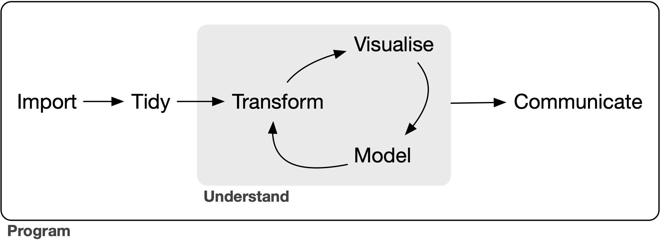 Surrounding all these tools is programming. Programming is a cross-cutting tool that you use in every part of a data science project. Programming tools in the tidyverse include: