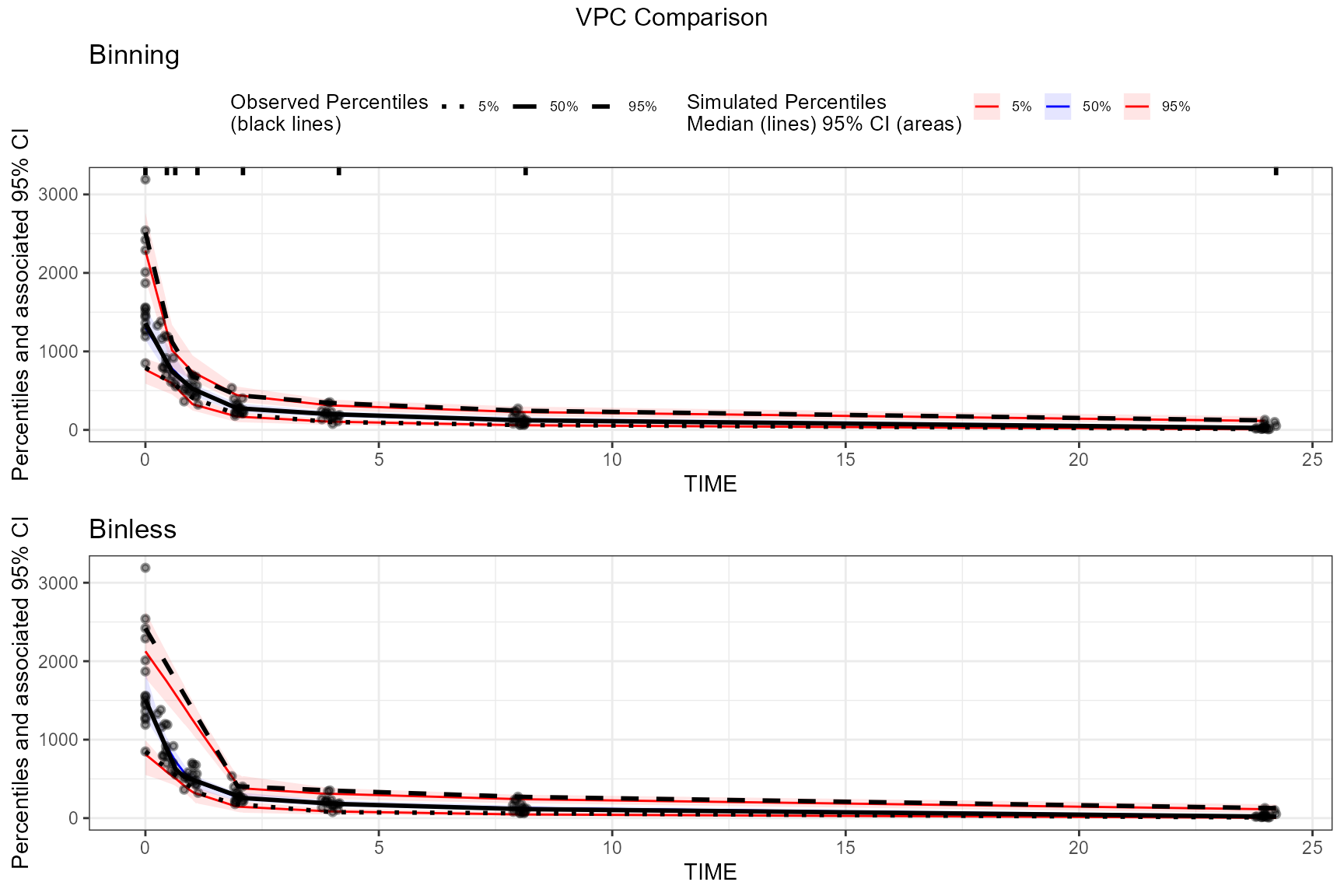 fit_vpc_sim <- vpcmodel(vpc_model)The resulting observed and simulated data can be found in the