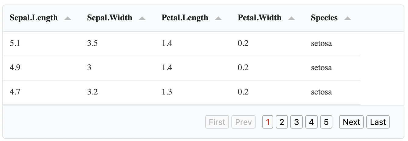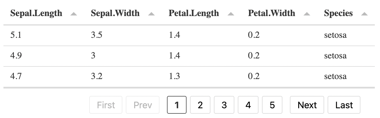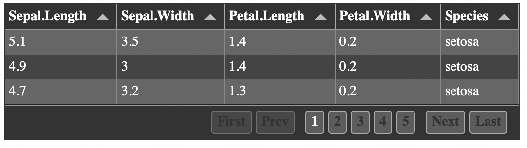 We also set search=TRUE to include a filtering box. Try typing the letters “vir” in the search box to filter the iris dataset and find the Virginica flowers.