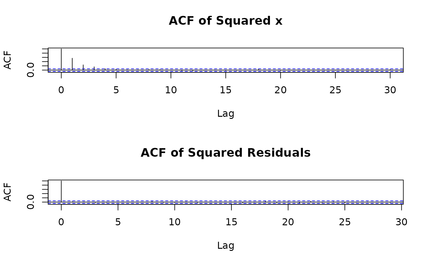 x.arch <- garch(x, order = c(0,2)) # Fit ARCH(2)