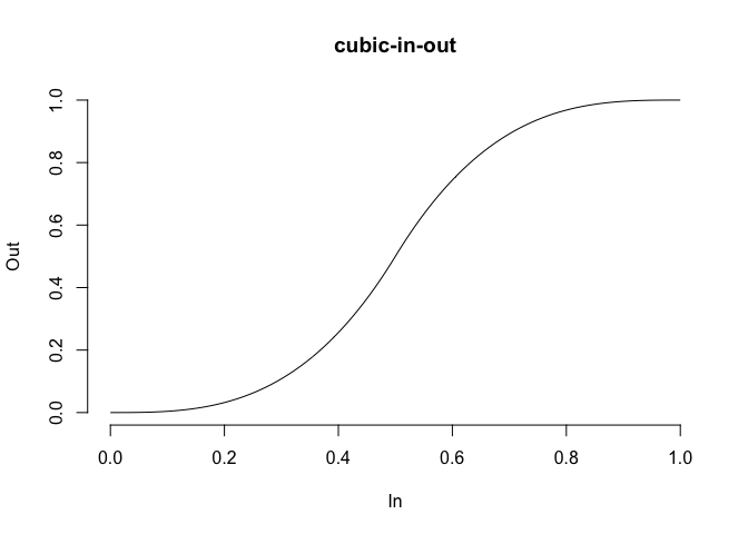 In order to get smooth transitions you’d often want a non-linear interpolation. This can be achieved by using an easing function to translate the equidistant interpolation points into new ones. tweenr has support for a wide range of different easing functions, all of which can be previewed using display_ease() as here where the popular cubic-in-out is shown: