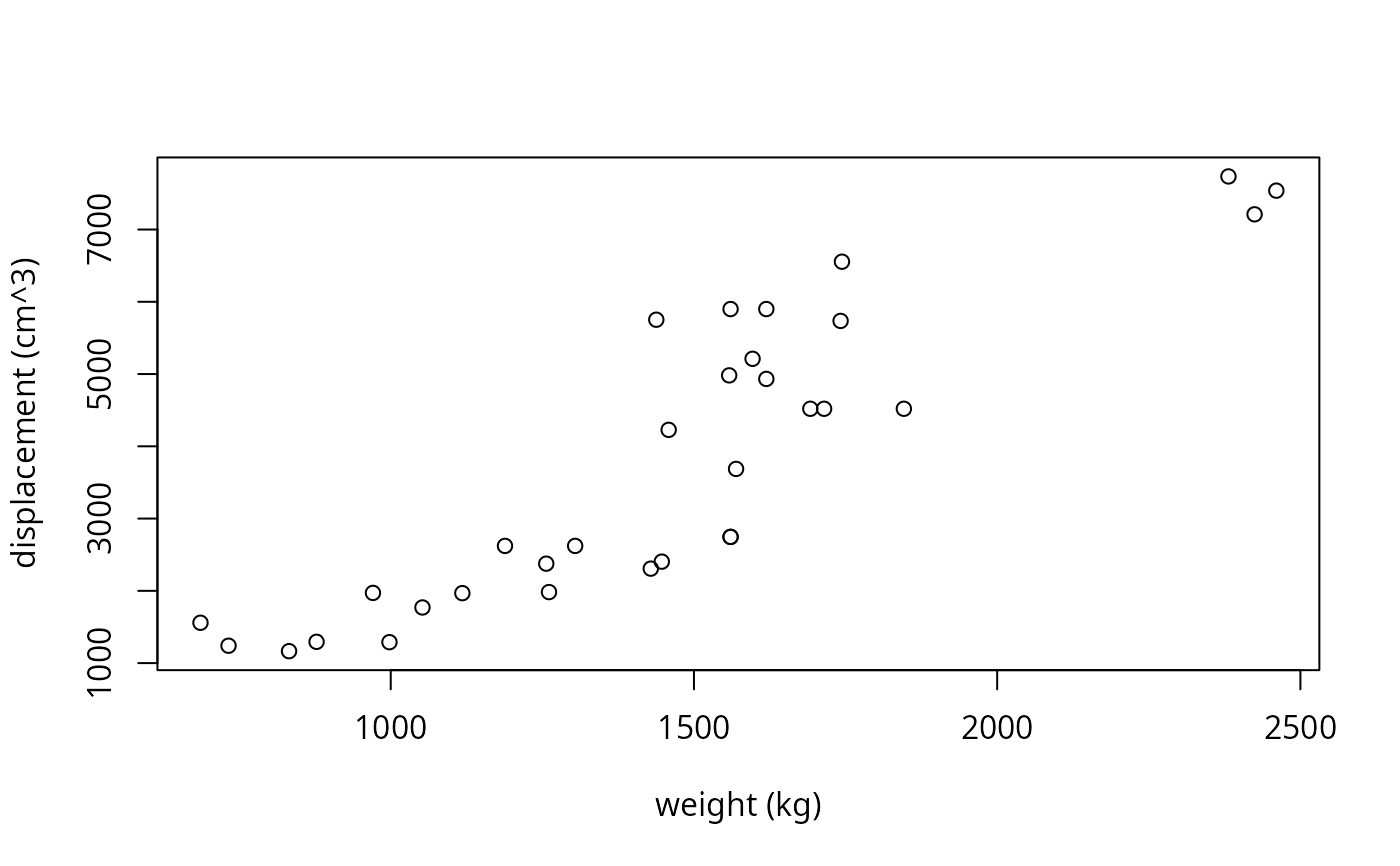 plot(x, y, xlab = NULL, ylab = NULL, ...)length one character; name of the variable to plot