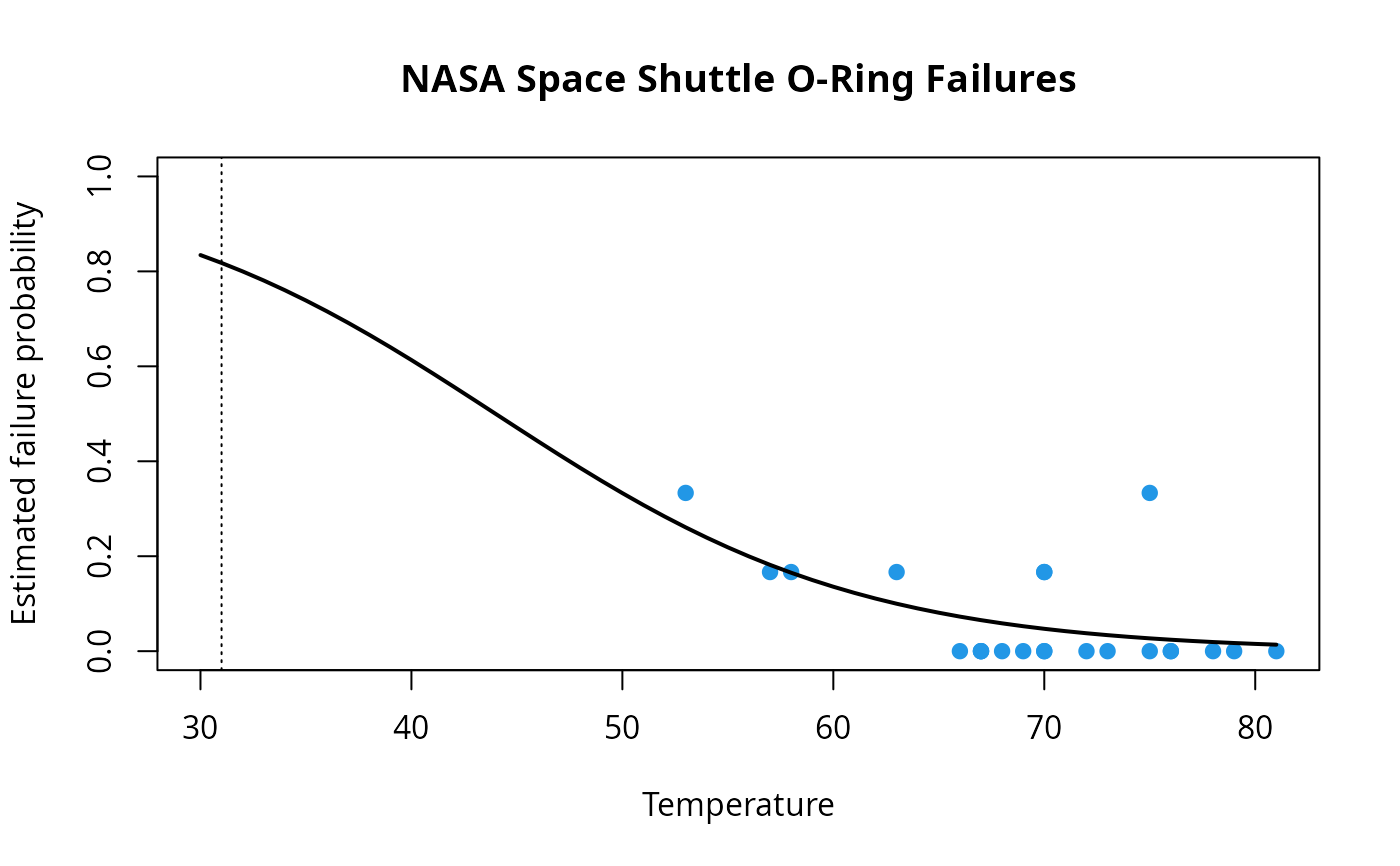 S. Dalal, E. B. Fowlkes, B. Hoadly (1989), Risk analysis of the space shuttle: Pre-Challenger prediction of failure, Journal of the American Statistical Association, 84, 945–957.