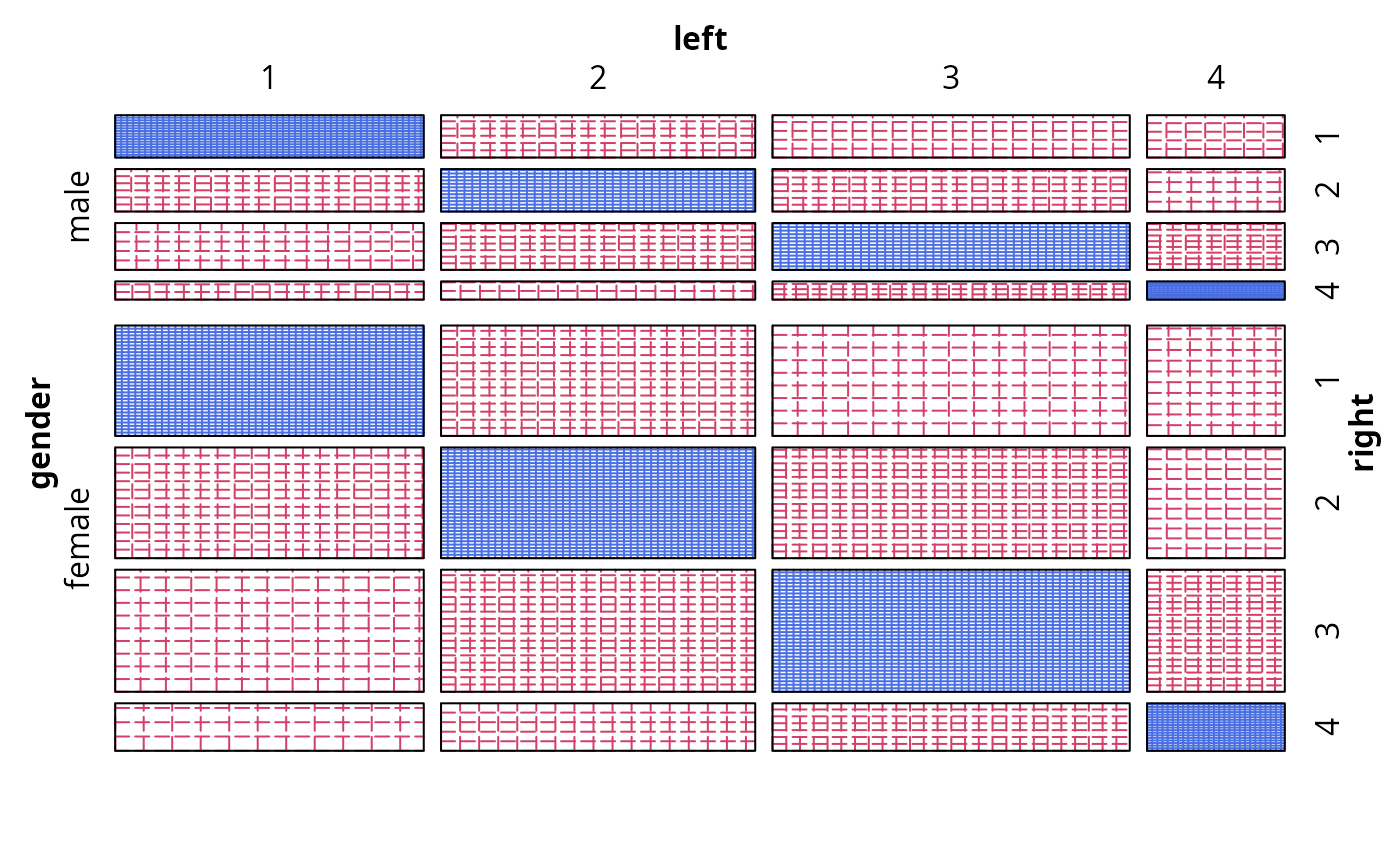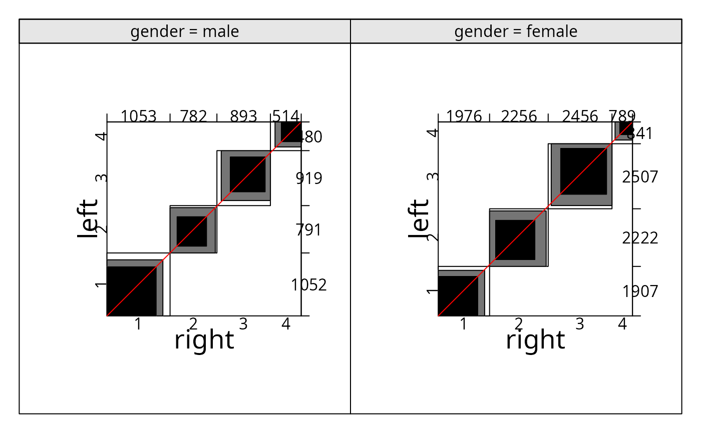 sieve(Freq ~ left + right | gender, data = VisualAcuity, shade = TRUE)
