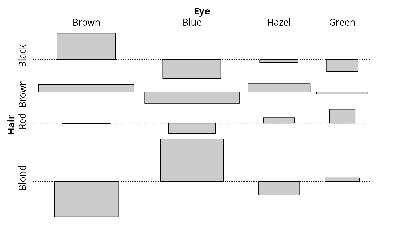 where \(f_{ij\ldots k}\) and \(e_{ij\ldots k}\) are the observed and expected counts corresponding to the cell. In the association plot, each cell is represented by a rectangle that has (signed) height proportional to \(d_{ij\ldots k}\) and width proportional to \(\sqrt{e_{ij\ldots k}}\), so that the area of the box is proportional to the difference in observed and expected frequencies. The rectangles in each row are positioned relative to a baseline indicating independence (\(d_{ij\ldots k} = 0\)). If the observed frequency of a cell is greater than the expected one, the box rises above the baseline, and falls below otherwise.