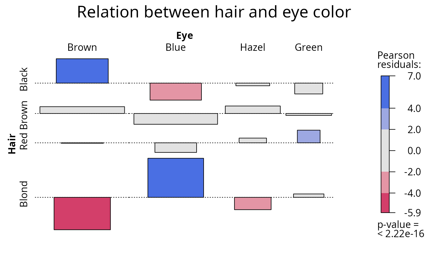 assoc(x, main = "Relation between hair and eye color", shade = TRUE)