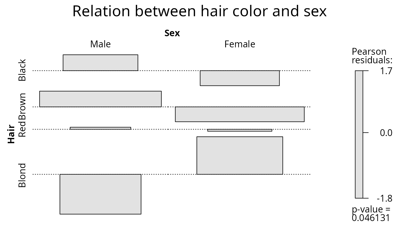 assoc(x, main = "Relation between hair color and sex", shade = TRUE)