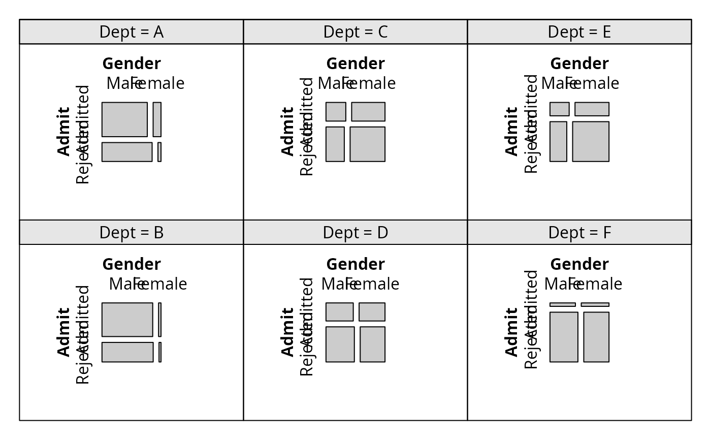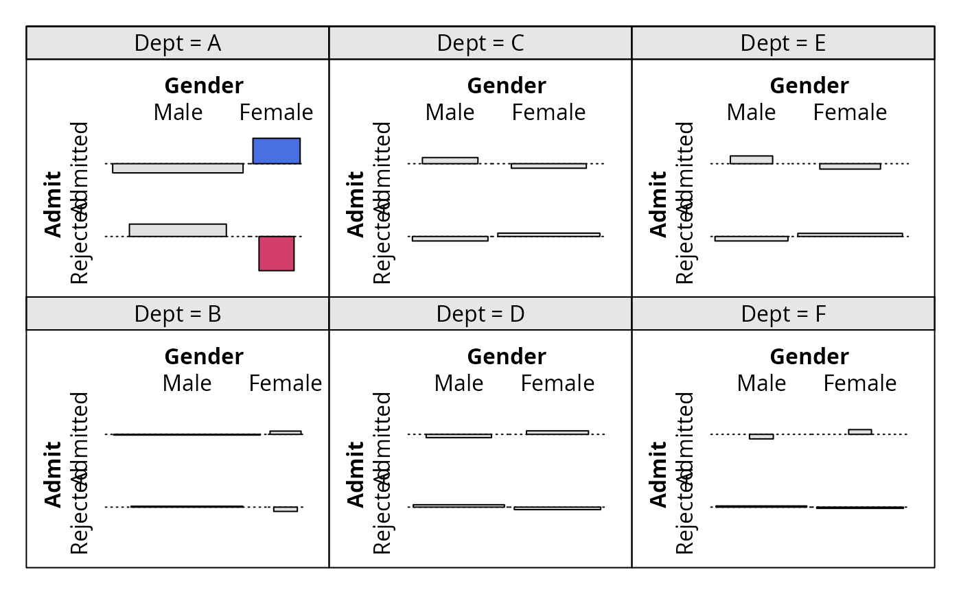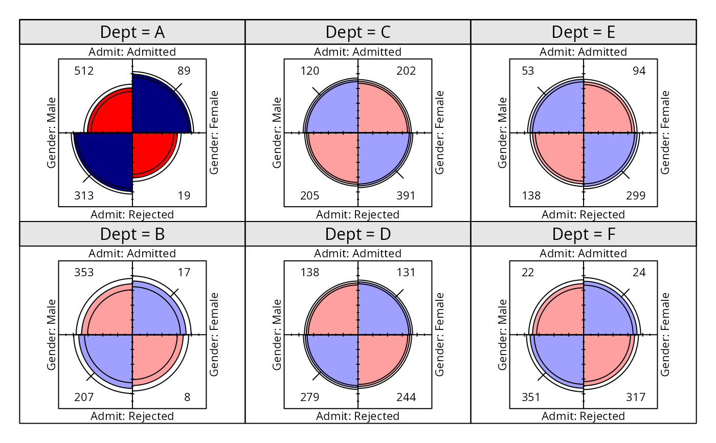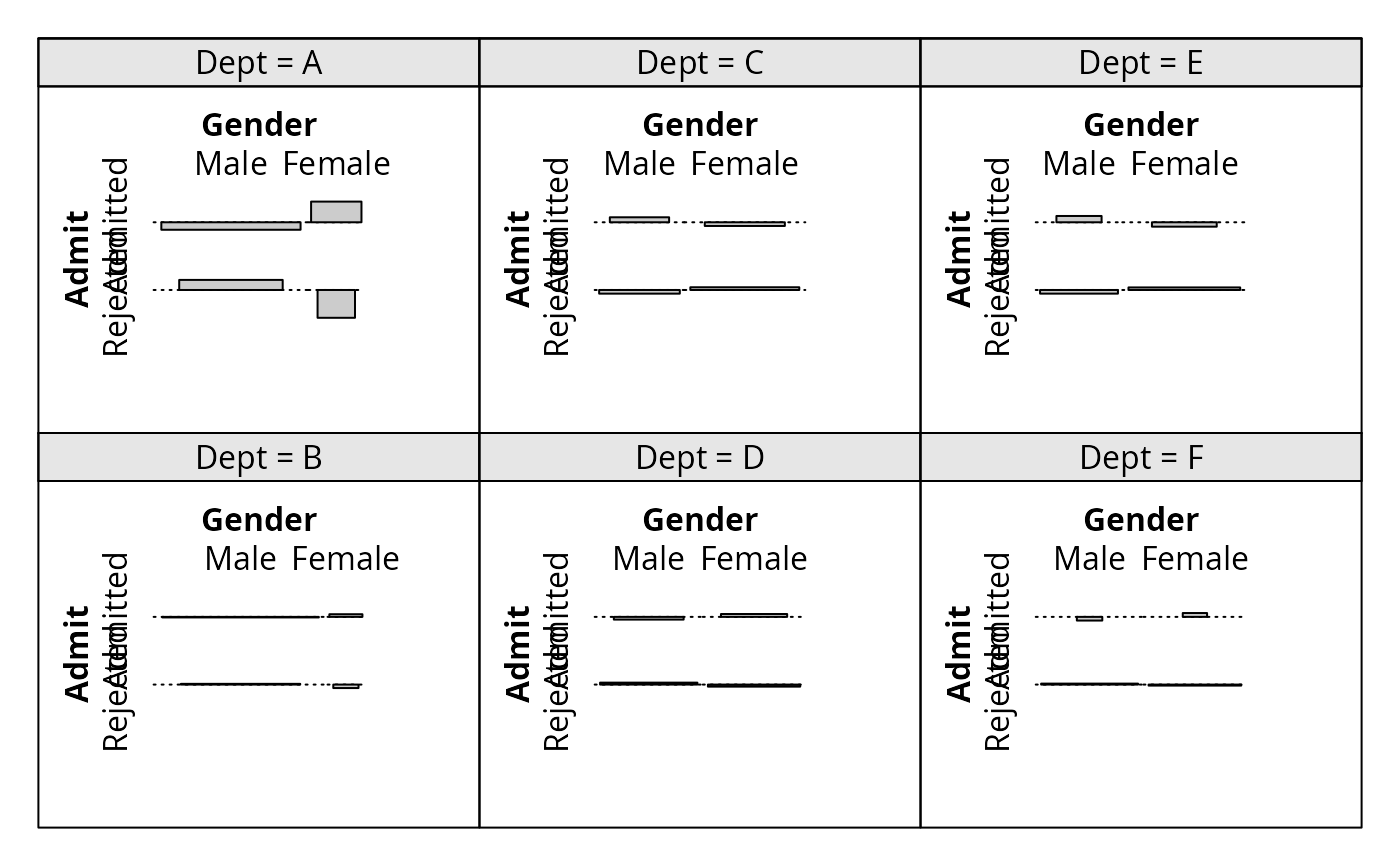 cotabplot(~ Admit + Gender | Dept, data = UCBAdmissions)