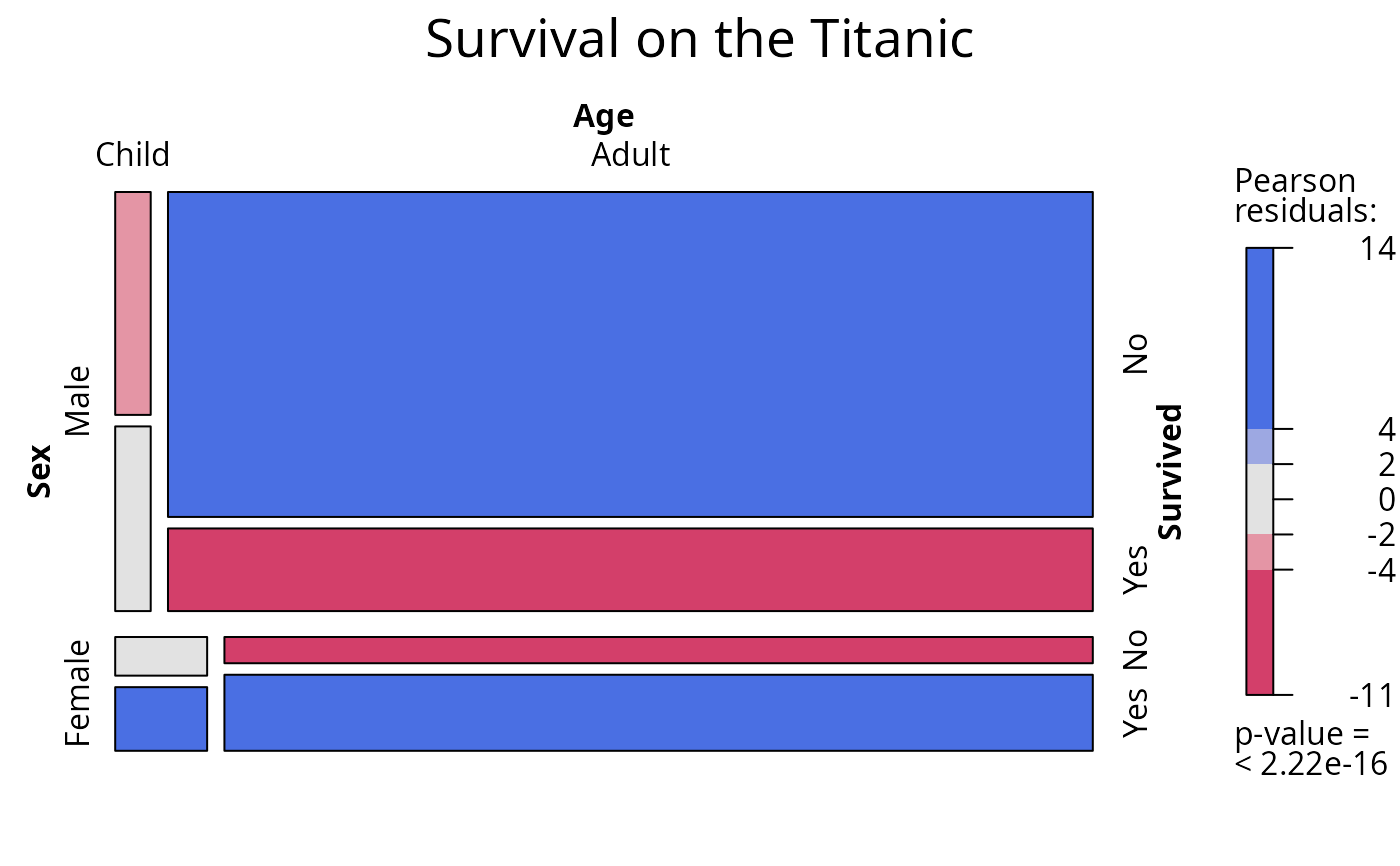 main = "Survival on the Titanic", shade = TRUE, legend = TRUE)