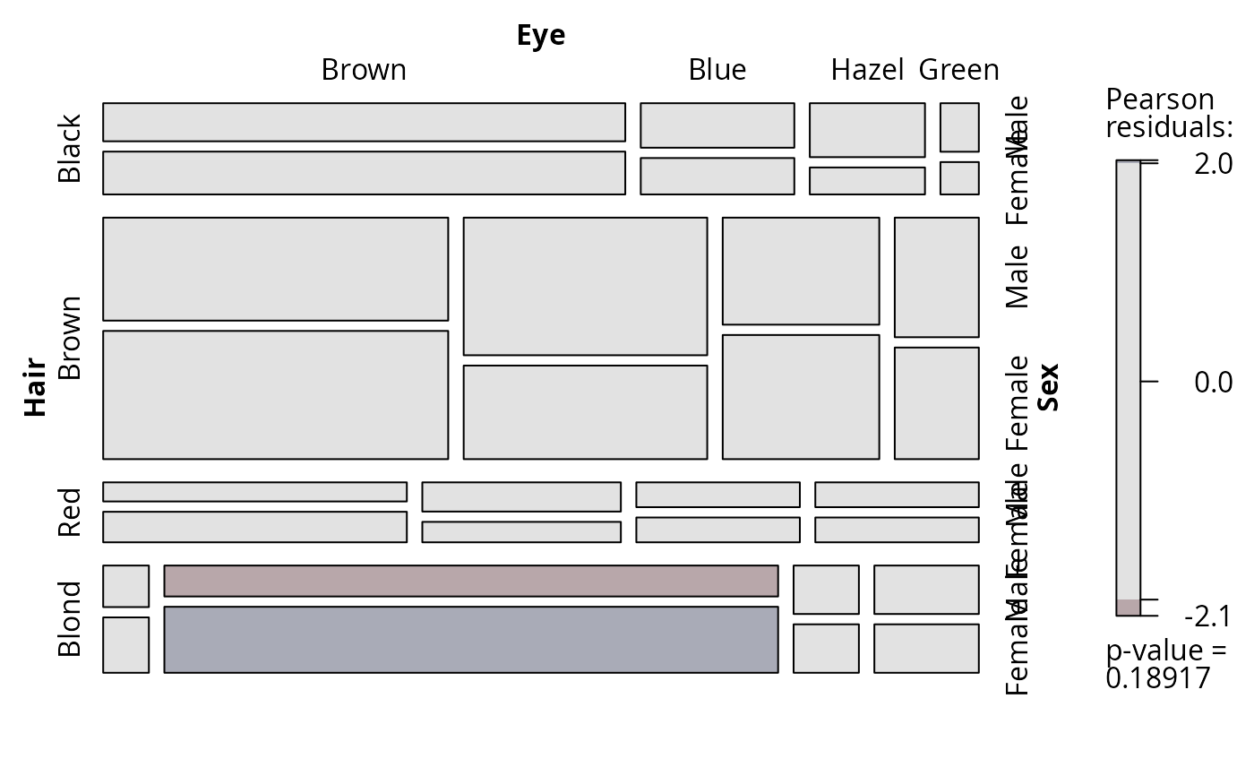 mosaic(HairEyeColor, shade = TRUE, expected = list(c(1,2), 3))