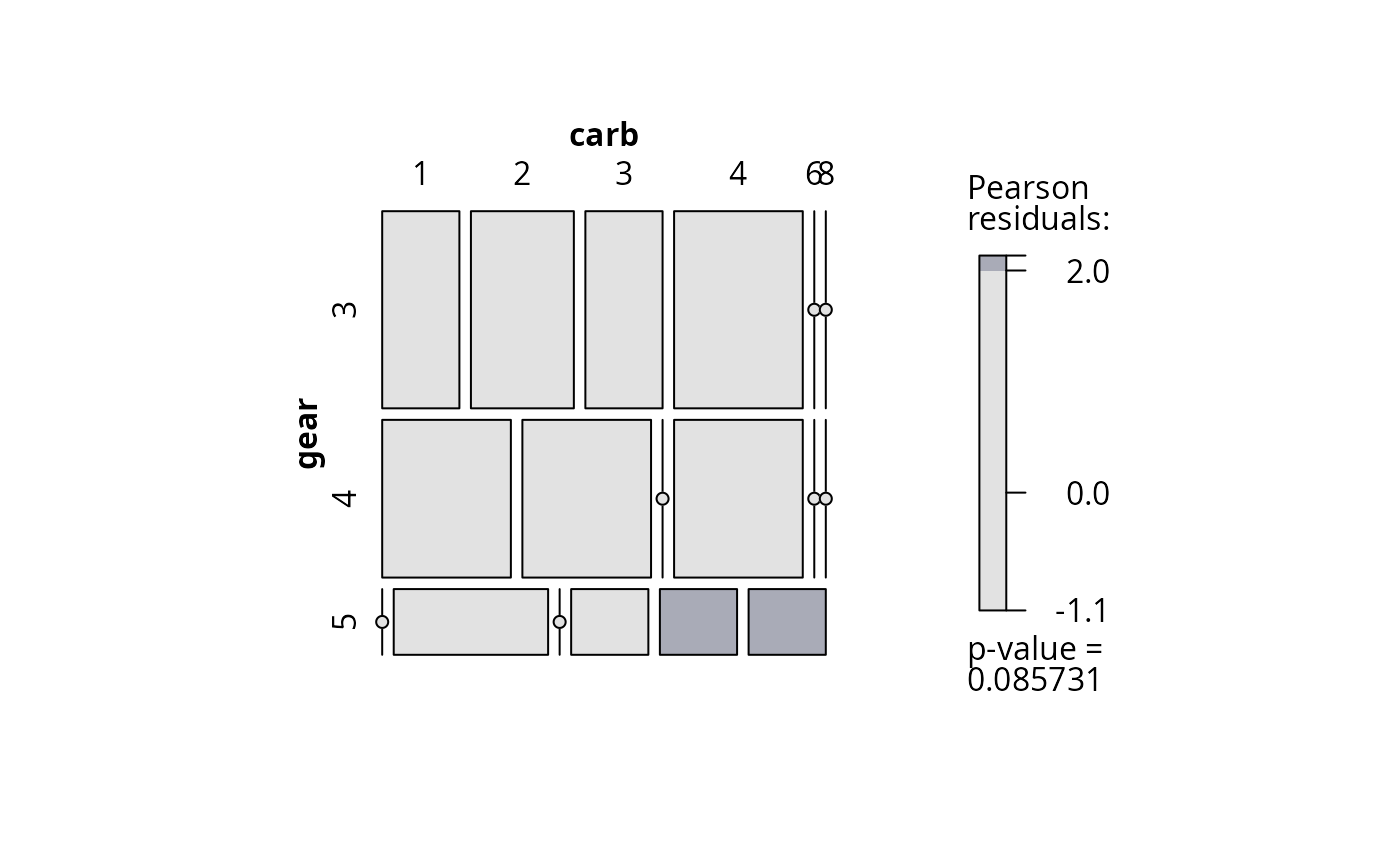 mosaic(~ gear + carb, data = mtcars, shade = TRUE)