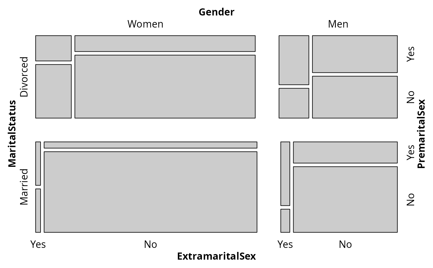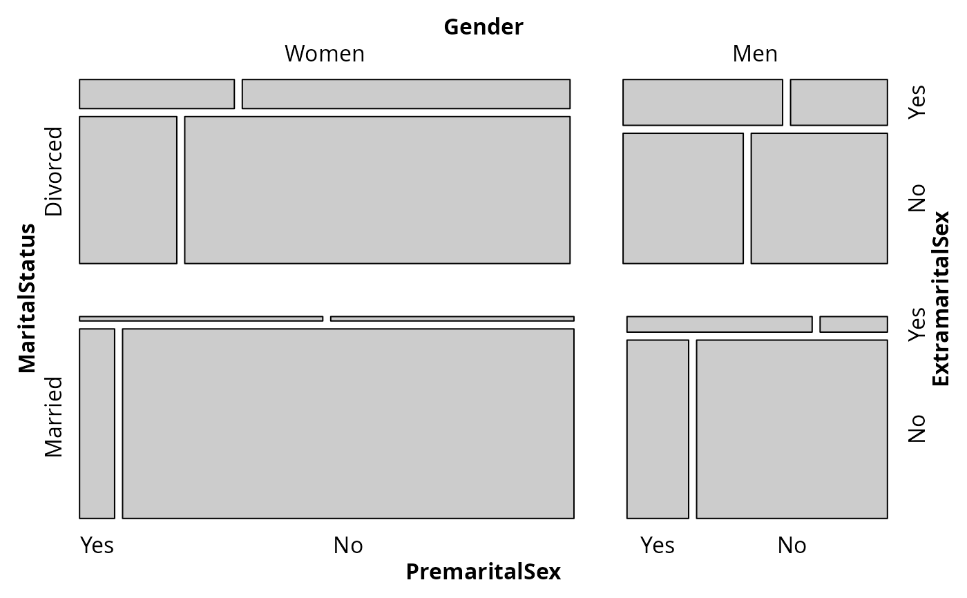 mosaic(~ ExtramaritalSex + PremaritalSex | MaritalStatus + Gender,