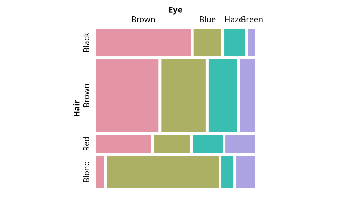 mosaic(HairEyeColor, gp = shading_Marimekko(HairEyeColor))