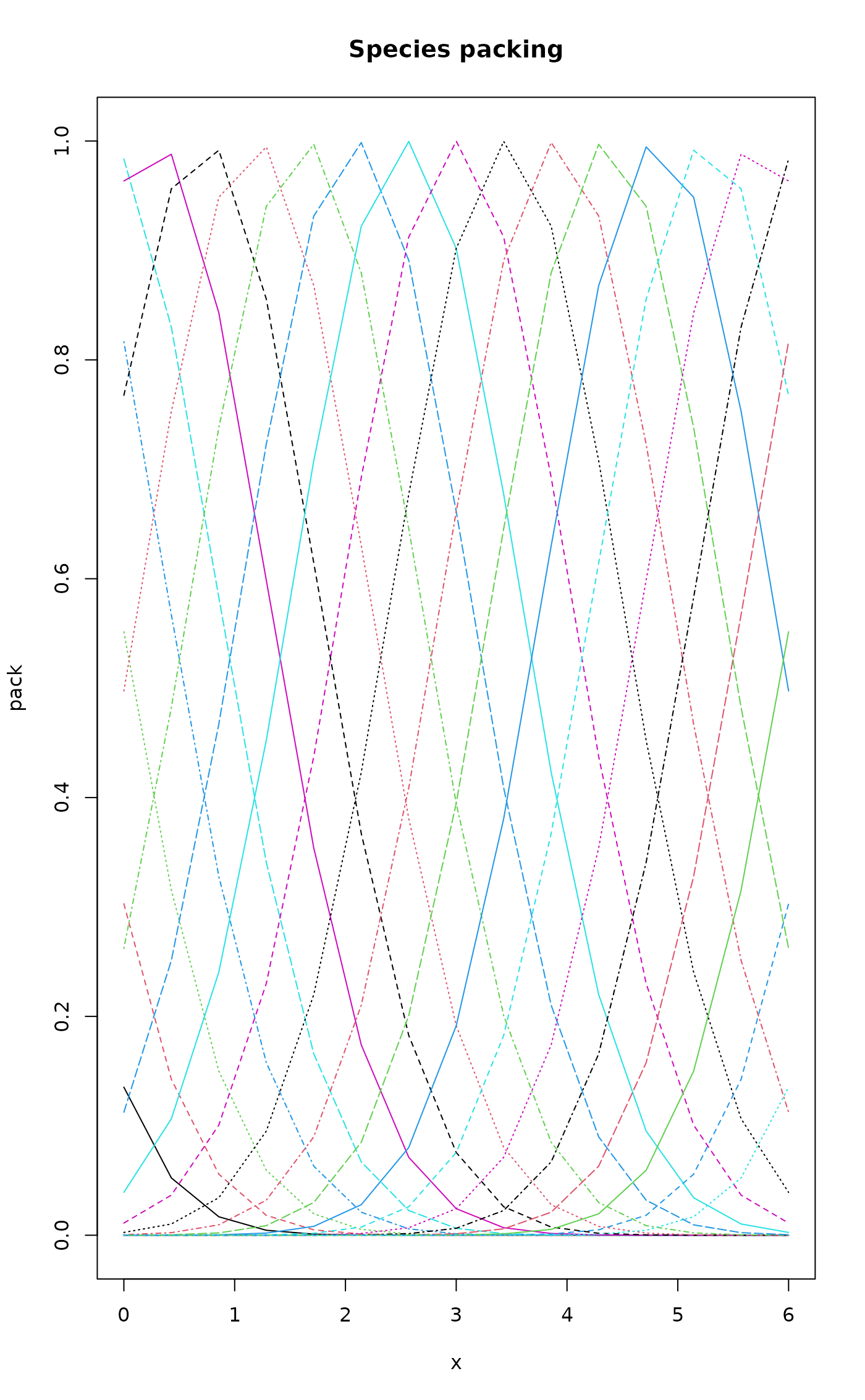 matplot(x, pack, type="l", main="Species packing")