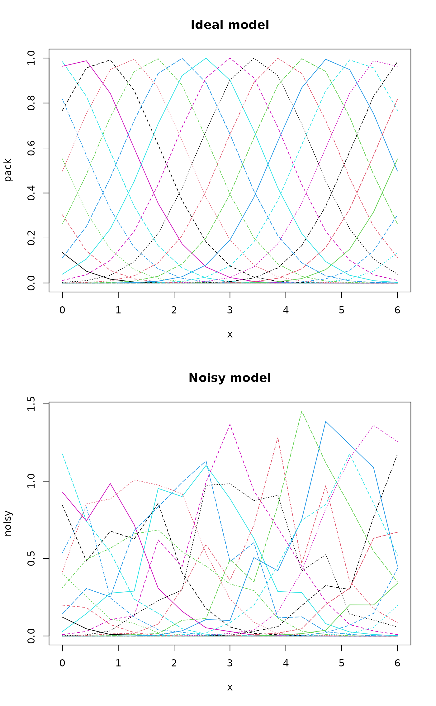matplot(x, noisy, type="l", main="Noisy model")