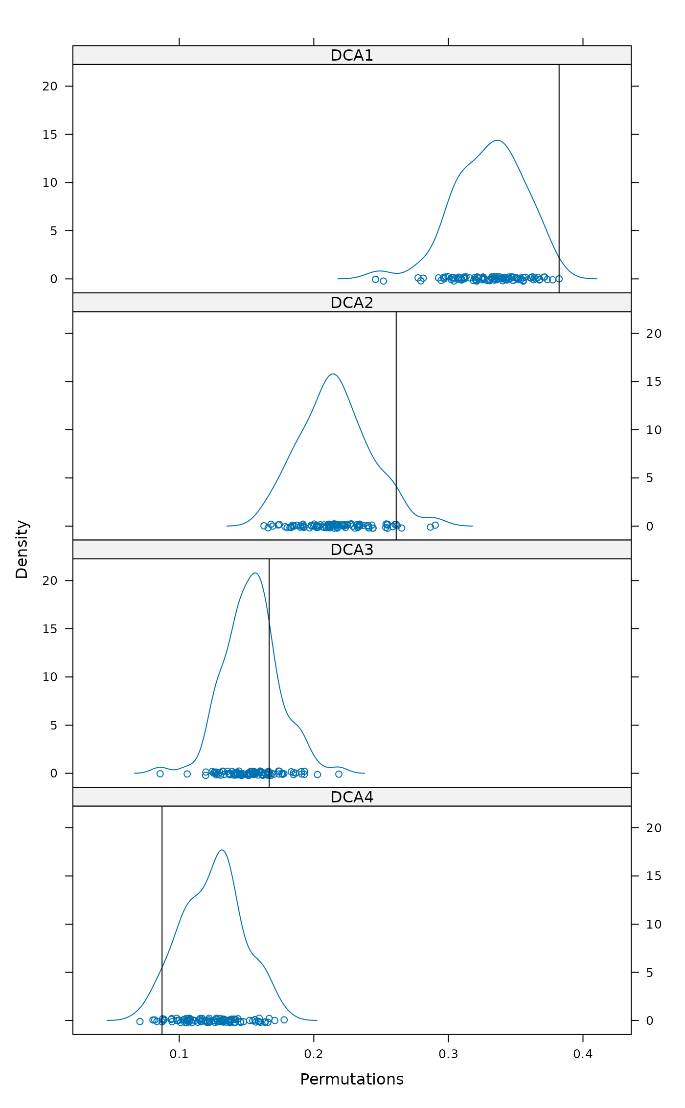 #> Call: oecosimu(comm = sipoo, nestfun = decorana, method = "swap",