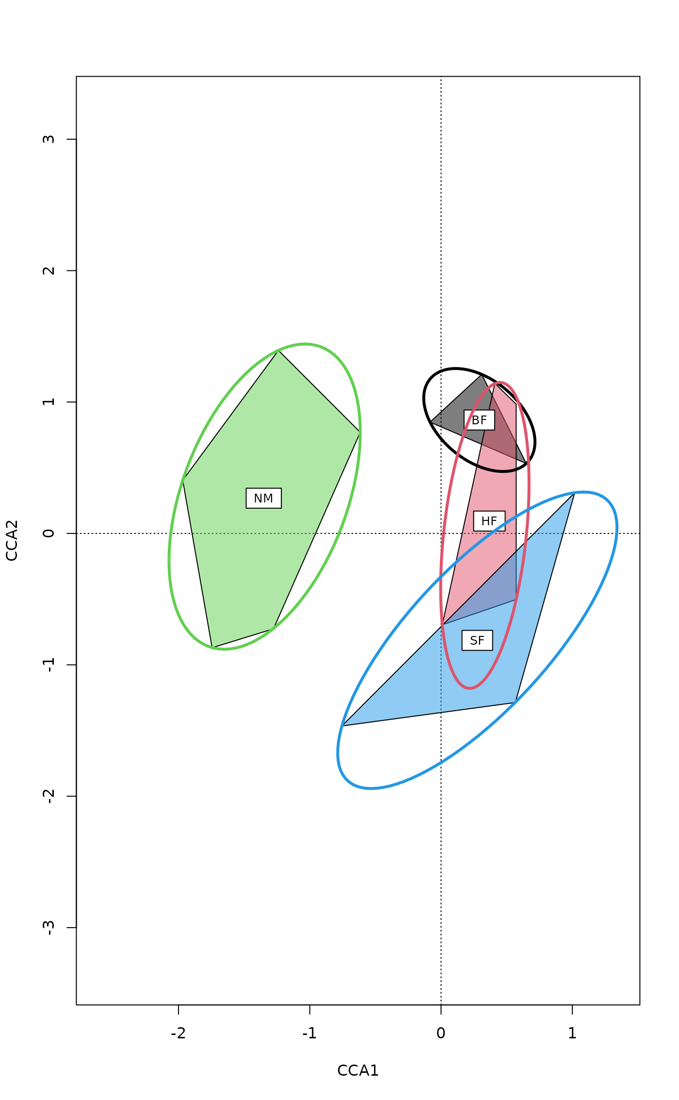 ordiellipse(ord, groups, display="sites", kind = c("sd","se", "ehull"),