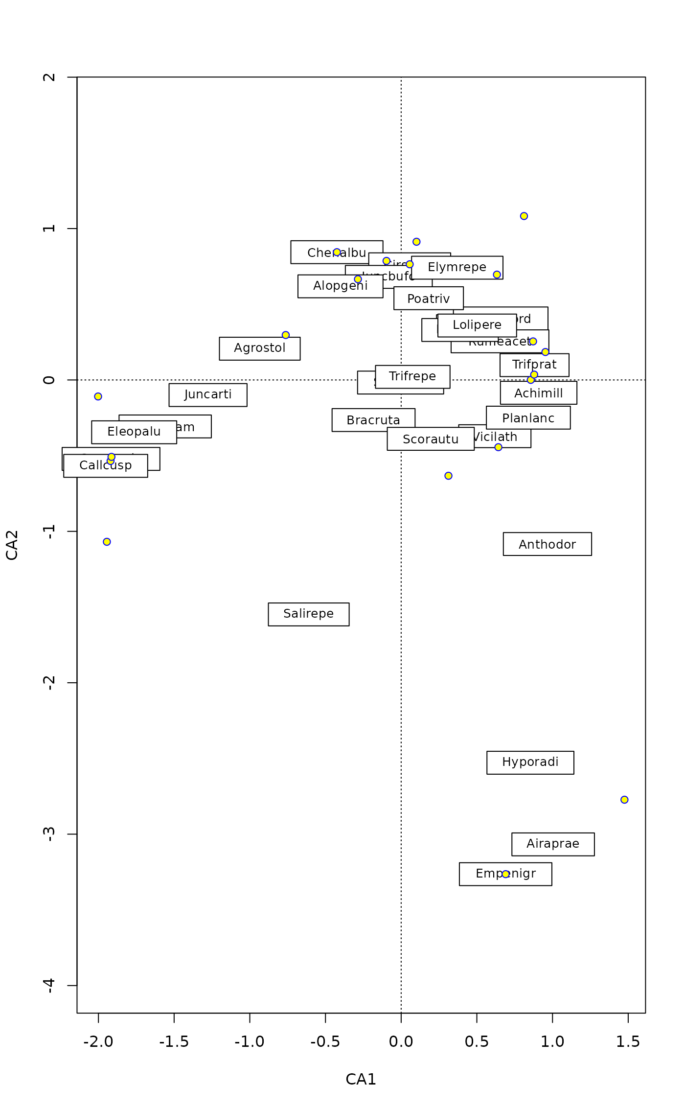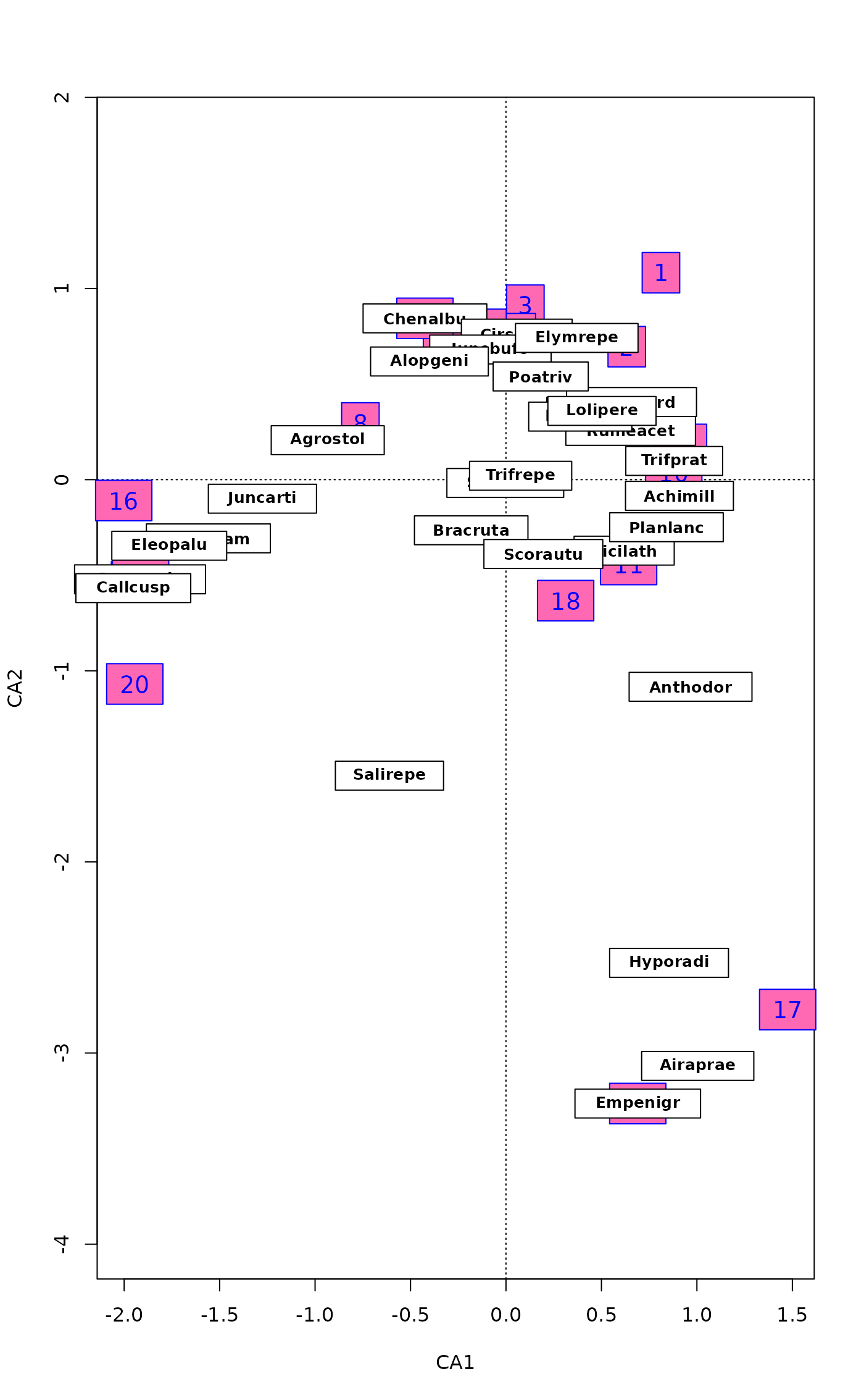 ordilabel(ord, dis="sp", font=2, priority=colSums(dune))