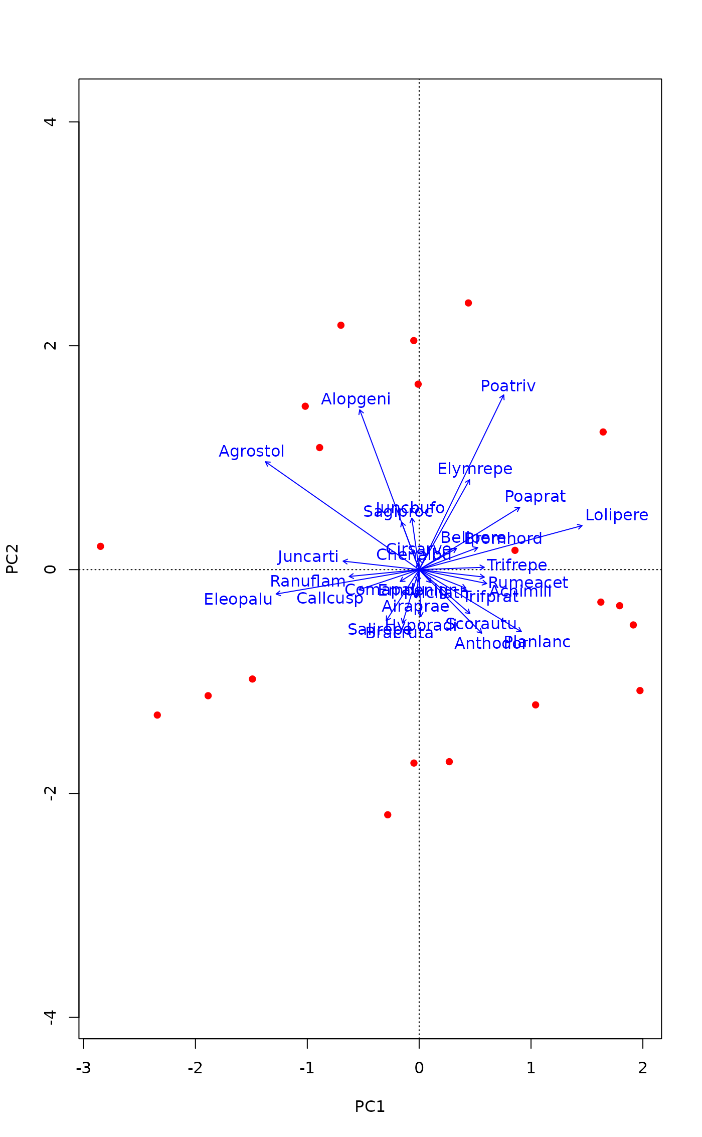 text("species", arrows = TRUE, length=0.05, col="blue")
